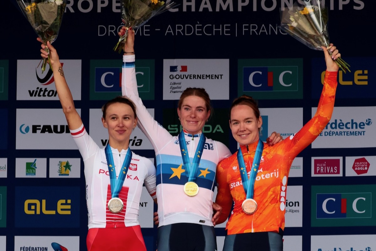 フランス南東部のドローム県とアルデシュ県にまたがり開催中のロードヨーロッパ選手権。最終日前日である10月4日に女子エリートのロードレースが行われ、79名の選手たちによって白地に3種の青横線、そして欧州旗の星があしらわれたヨーロッパ王者ジャージが争われた。