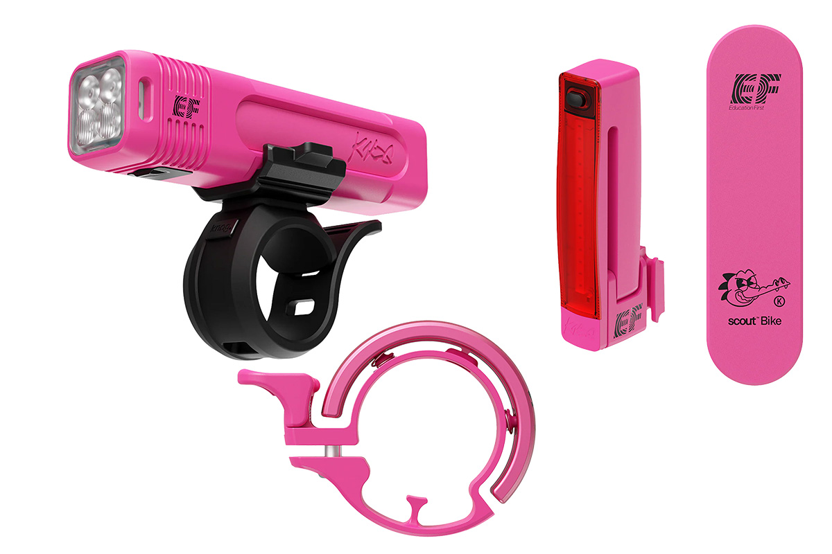 そんなノグとEFプロサイクリングがコラボしたアイテムが4種類登場する。ラインアップは、フロントライトのBLINDER 900、リアライトのPLUS、ベルのOI CLASSIC、盗難防止タグのSCOUT BIKEで、いずれもチームカラーのピンクで彩られている。