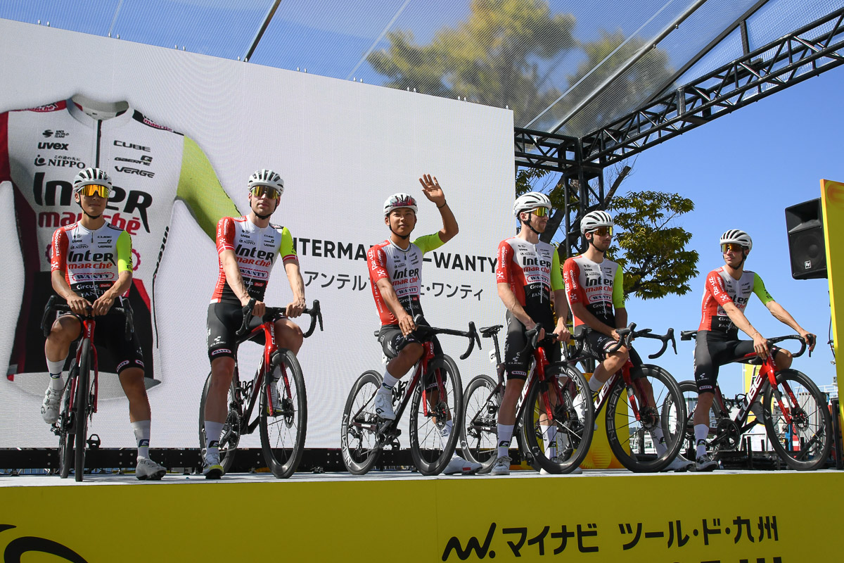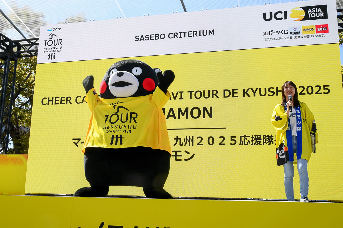 JR佐世保駅の目の前、佐世保港に面する「佐世保ポートサイド公園」をメイン会場に、隣接する商業施設などの周りを巡るコースは、1周1.5kmに11の直角コーナーが連続。うち1箇所は折り返しのヘアピンコーナーとなり、集団が長く引き伸ばされるのは必至なレイアウトだ。スタート前には出場全チームが登壇するチームプレゼンテーションが催された。
