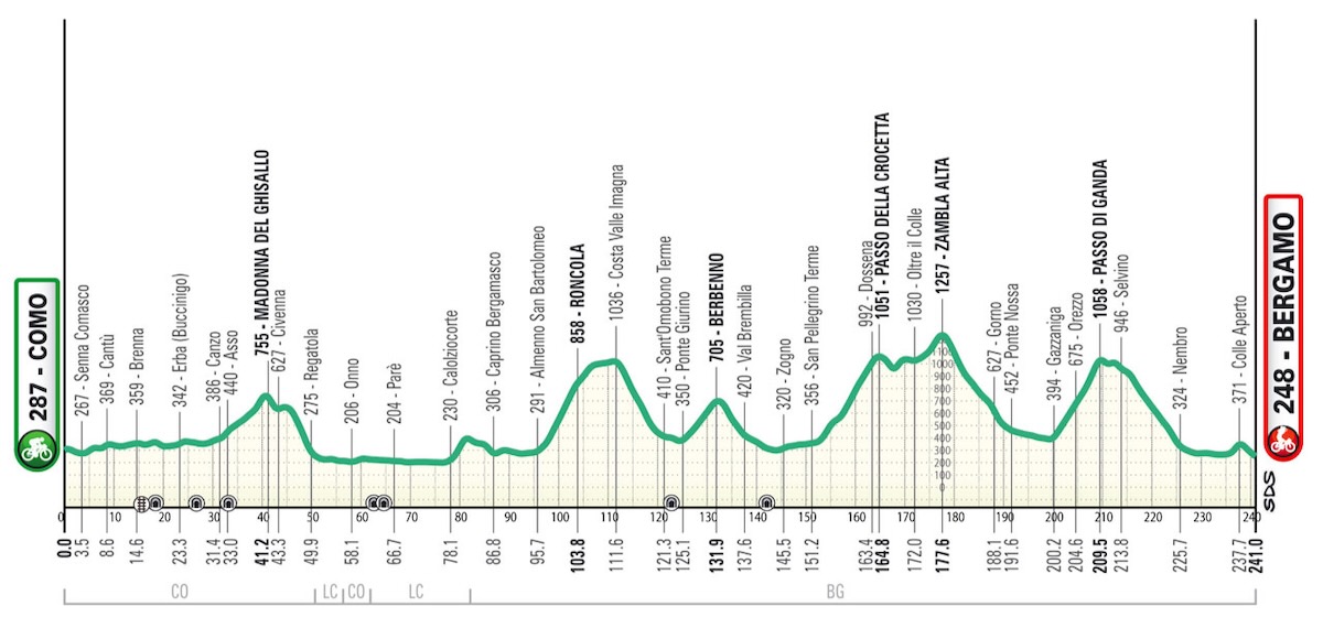 総距離241kmに4,500mを超える獲得標高差のため、有利なのはクライマーやパンチャーといった脚質の選手たち。最大の特徴は毎年スタートとフィニッシュ地点が入れ替わることで、奇数年の今年はコモを出発して、ベルガモが着地点となる。