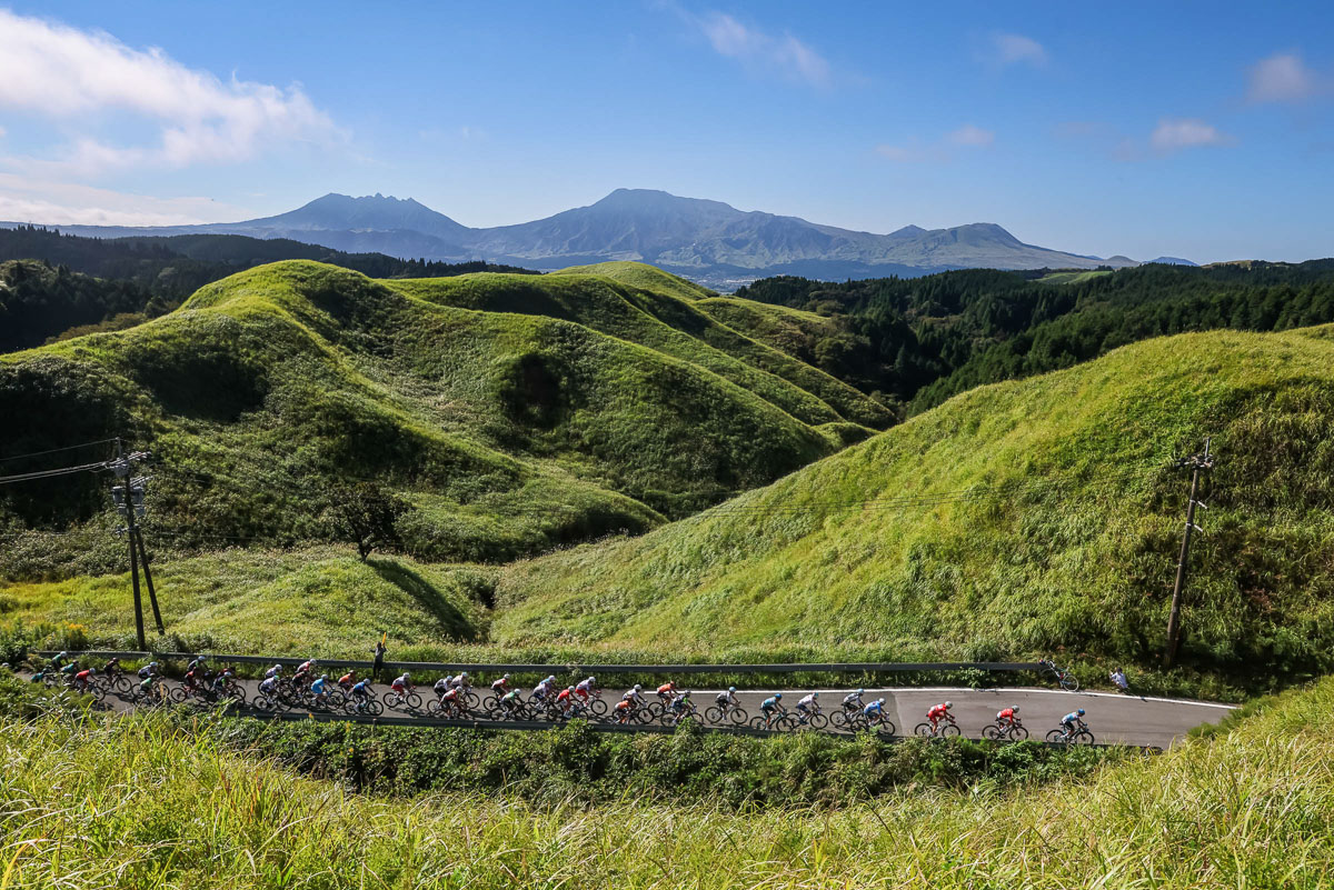 ツール・ド・九州2日目は熊本県でのステージ。阿蘇山の北に位置する南小国町をスタートし、世界最大級の阿蘇山カルデラの中に設定された1周30.36kmの周回コースを2周したのち、南阿蘇村にフィニッシュする114.85km。周回コース部分には1級山岳2回、スプリントポイントは周回部分2回とコース終盤に1回の計3回設定される。