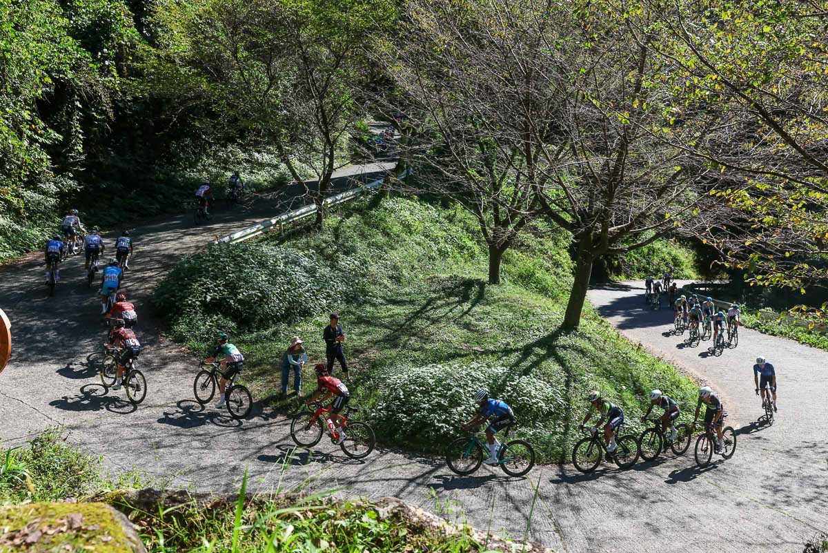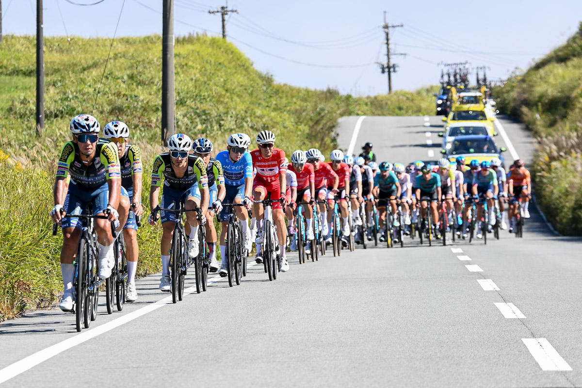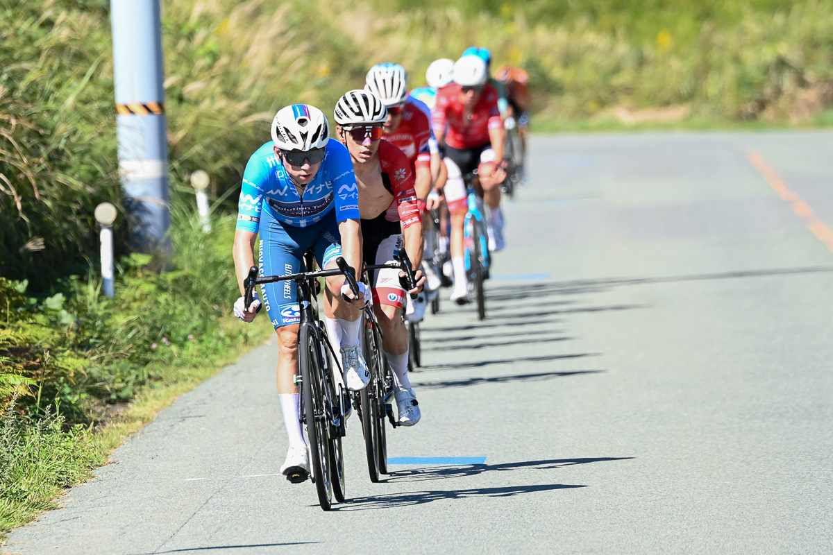 周回2周目に入り、登り区間に入るとトタルエネルジーが集団先頭に立ってペースアップし、先行していた織田とボネを吸収。2回目の2級山岳を前にジョルダン・ジェガット(トタルエネルジー)とアレッサンドロ・ファンチェル(チーム右京)が抜け出して先行する。