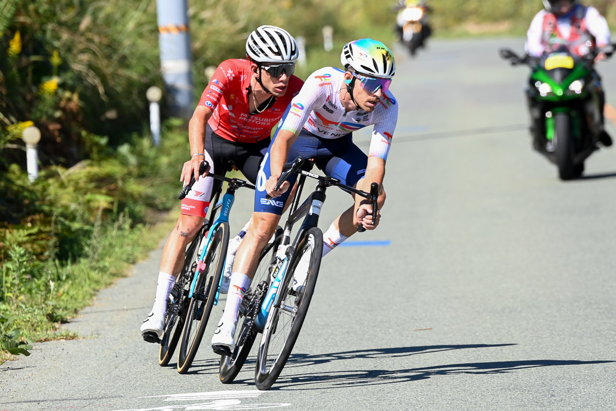 周回コースに入って登り区間に入ると、山岳賞ジャージを着る織田聖(マトリックスパワータグ)と、トマ・ボネ(トタルエネルジー)の2名が抜け出す。1回目の1級山岳を織田が先頭通過。その後は3後続に30秒前後の差をつけて先行する。