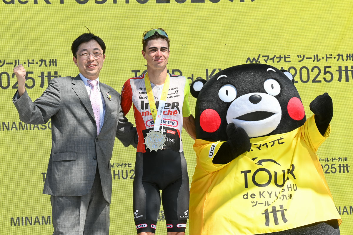 ステージ優勝のドリース・デポーテル(アンテルマルシェ・ワンティ)をくまモンが祝福 photo:Satoru Kato
