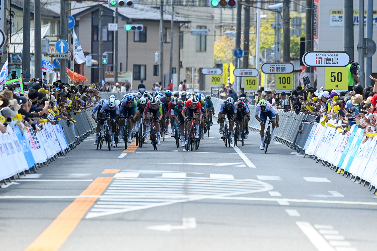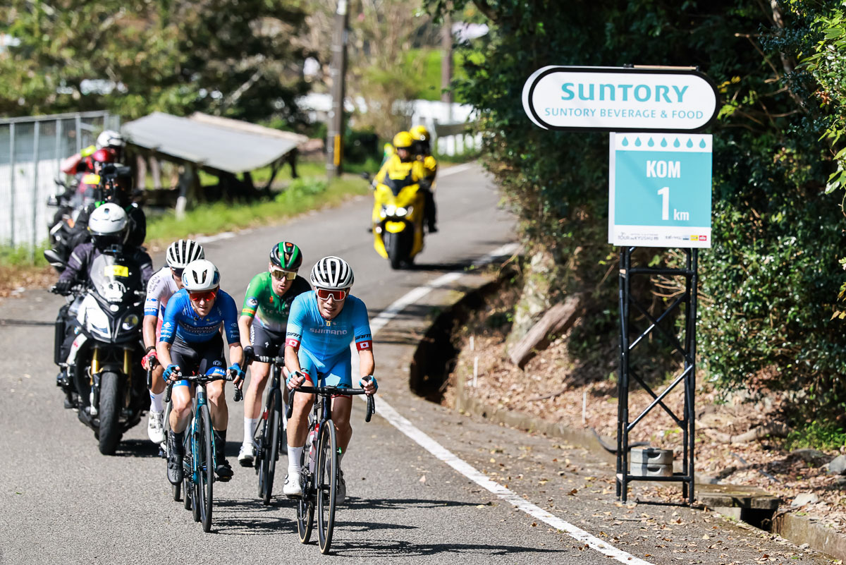 リアルスタートが切られるとアタック合戦が始まり、集団は長く引き伸ばされて進む。30km過ぎに設定された3級山岳に向けての登りで、入部正太朗(シマノレーシング)、宇賀隆貴(キナンレーシングチーム)らを含む4名の集団が先行。一時30秒差をつけて先行するものの、3級山岳通過後に吸収される。
