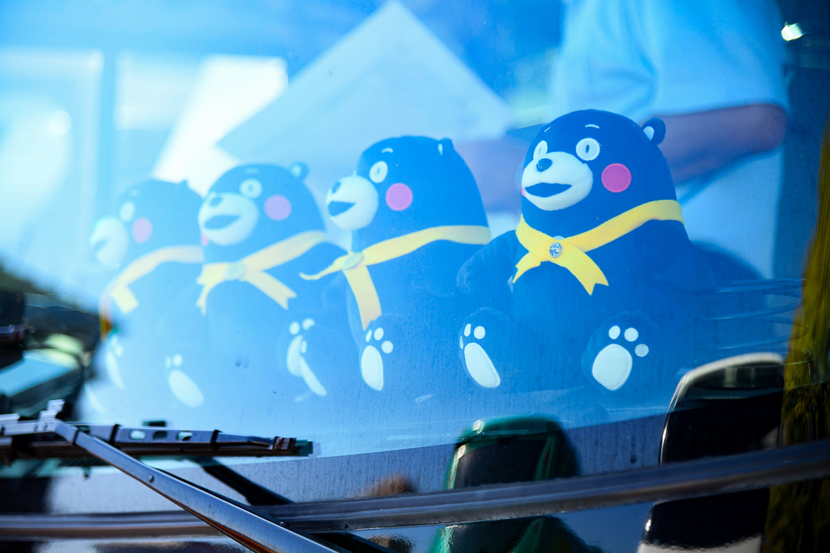ソリューションテック・ヴィーニファンティーニのバスにはくまモンのぬいぐるみが並ぶ photo:Satoru Kato
