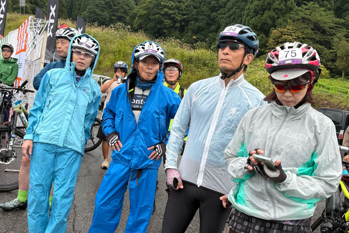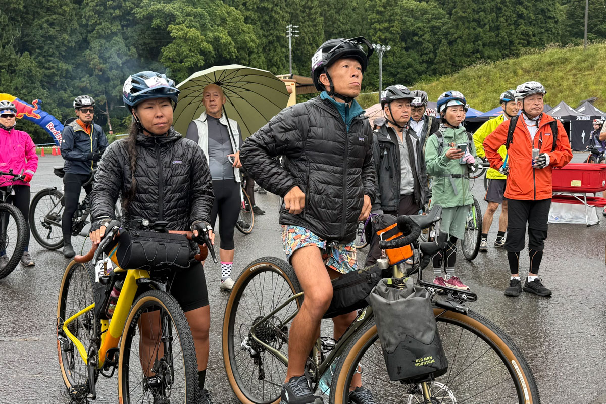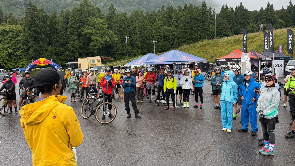 グラベルは朝のブリーフィングから始まる。しかしこの日は朝から生憎の雨模様..。レインウェアに身を包んだサイクリストが会場に集まり、実行委員長の河野さんから説明を受ける。