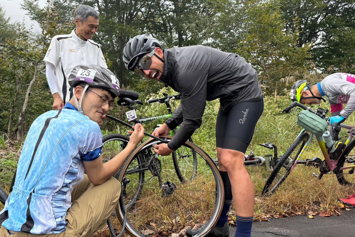 パンクした参加者を見つけると直してくれたパナレーサーのお助けマン photo:Makoto AYANO