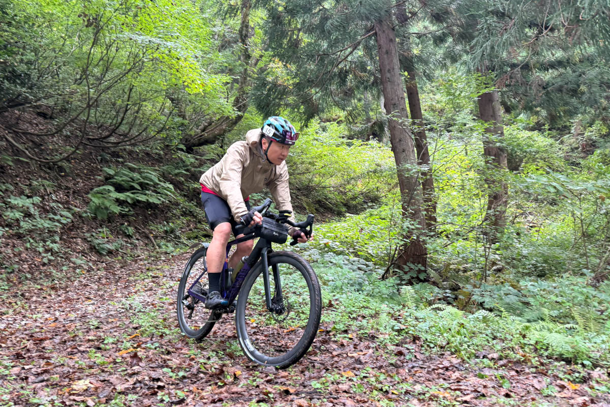 大きめの石もある荒れた路面、落ち葉に隠れたガレた林道に、タイヤの空気圧設定が甘い人はまず苦労する。運悪くパンクする人もちらほら。実はこのグラベルツーリング、この最初の下り区間が最難関と言えそうだ。