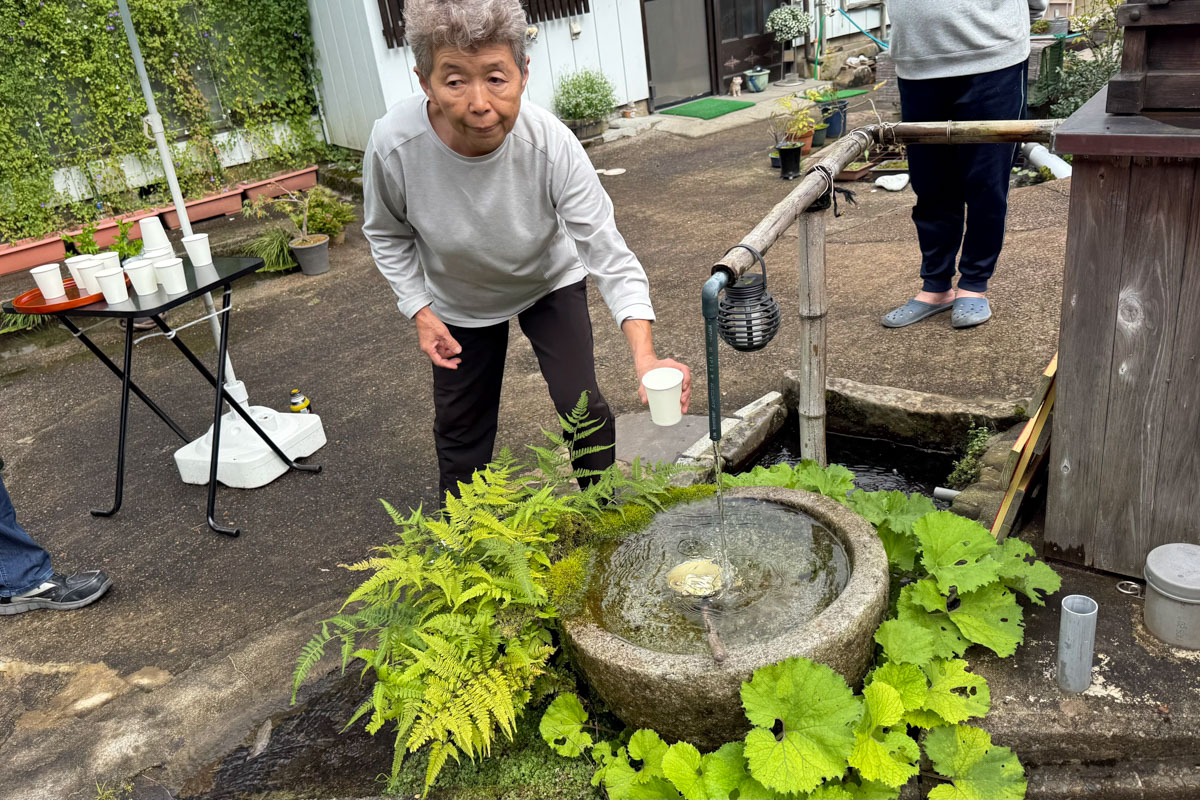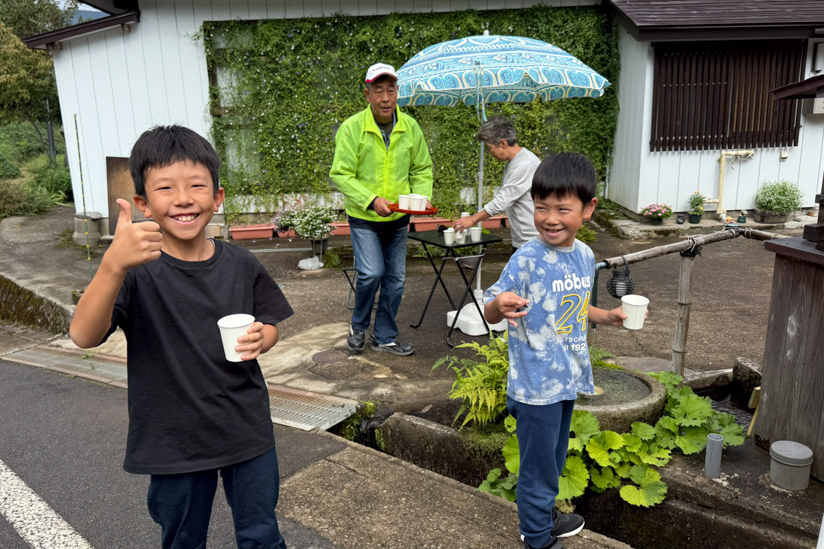 標高差で約1,000mを一気に降ると、最初の小休止ポイントは湧き水のある民家の前。ここは公式エイドではないのだが、その民家に住む一家がセルフエイドとして天然の湧き水をふるまってくれるのだ。有名な飯山の銘酒「水尾」の原料になっている湧き水を、子どもたちが紙コップに入れて渡してくれた。