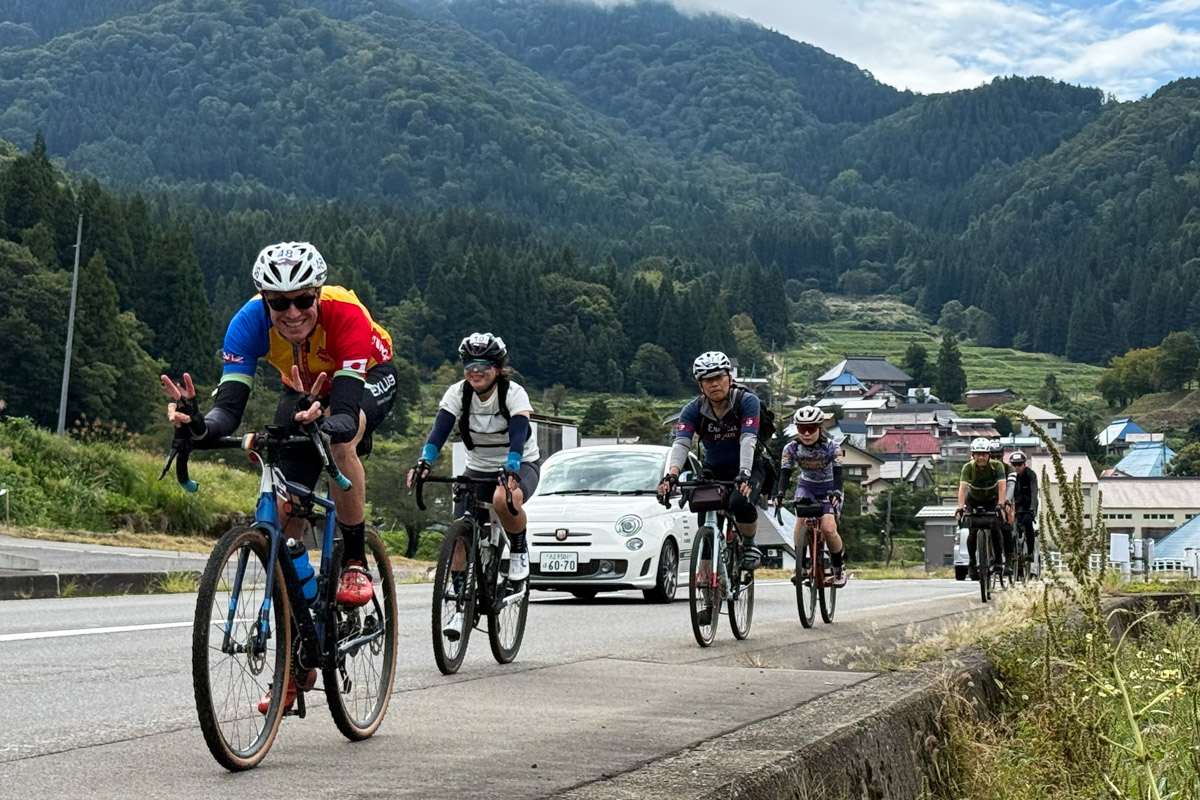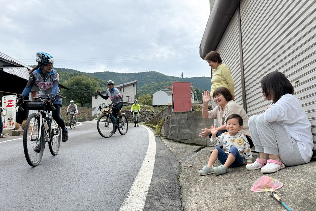 いきなり地元の方々と触れ合えるのが素敵。じつはこの民家の方は昨日のヒルクライムのフィニッシュエリアでもきのこ汁を振る舞ってくれました。