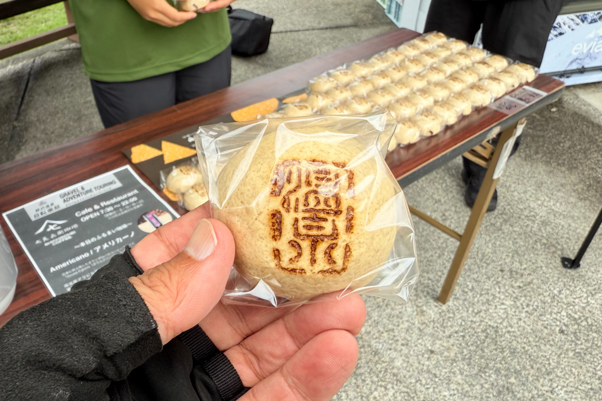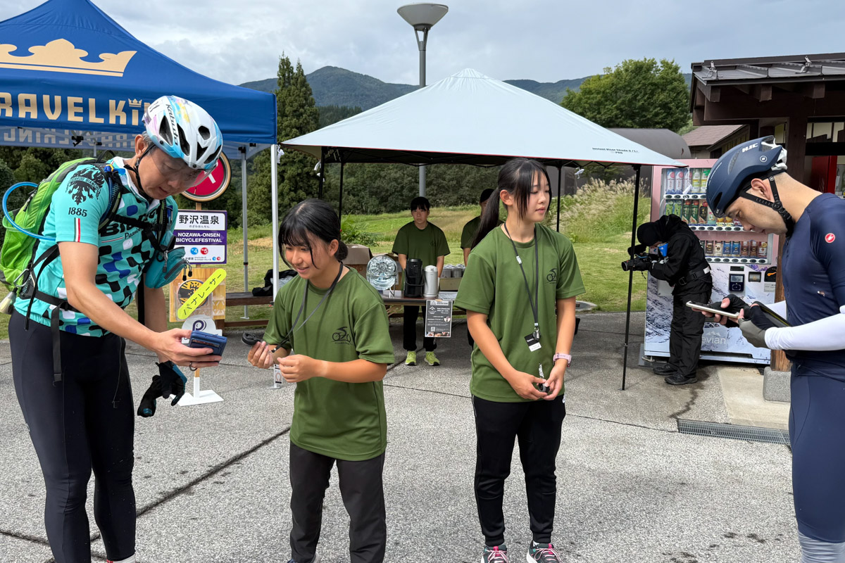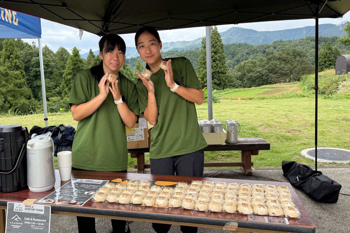 外界に降りると道の駅・野沢温泉のエイドがある。ここでは朝のお目覚に饅頭とコーヒーが供される。淹れたての本格派ドリップコーヒーに餡のまんじゅうが合うこと。振る舞ってくれるのは飯山高校スキー部の女子高生たちだ。