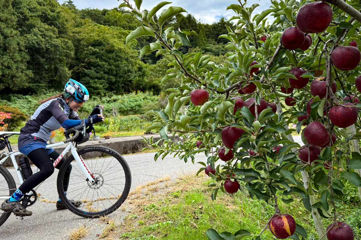斜面に伸びる農道を走っていると、農家の方が作業の手を休めて応援してくれるのがなんとも嬉しい。野沢温泉村と隣り合う飯山市の「いいやま観光協会・信越自然郷」が展開する「信越グラベル」もルートの一部となっていて、人里であっても地元の理解のもとに走ることができるのだ。