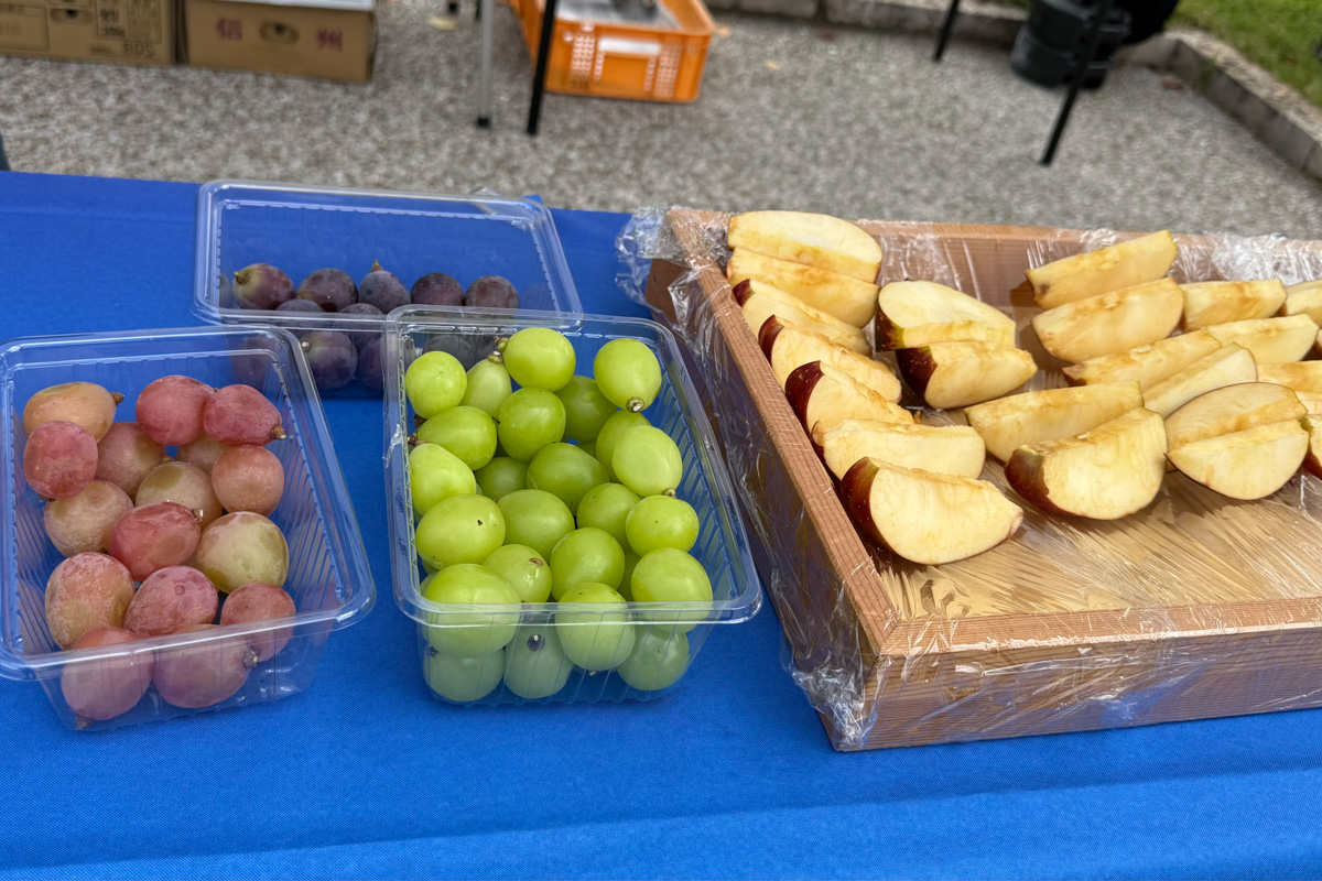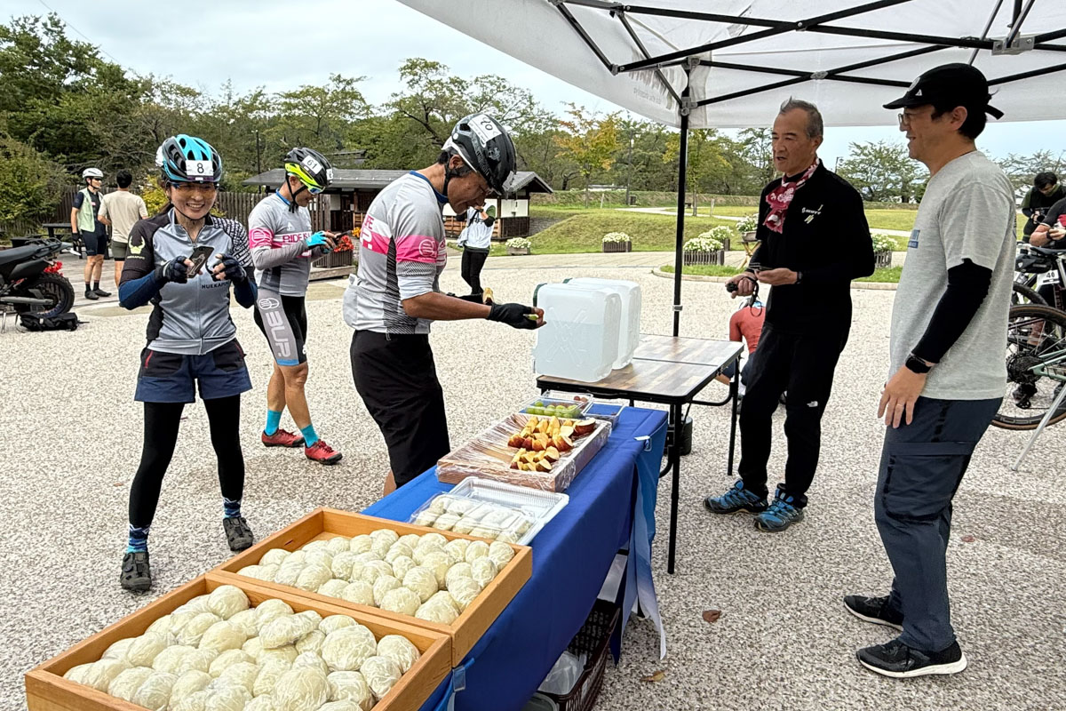 飯山城址公園エイドでは広域連携する飯山市の「いいやま観光局」の皆さんがお接待してくれた。信越自然郷サイクルツアーサポートバスがエイド脇に鎮座し、そこで休めるゴキゲンな空間が広がる。ぶどうやりんごをいただきながら、スタッフの皆さんには信越グラベルを開拓してきた話も聞けたし、誰でもサイクルツアーに利用できる自慢のバスの中や装備も見学できた。