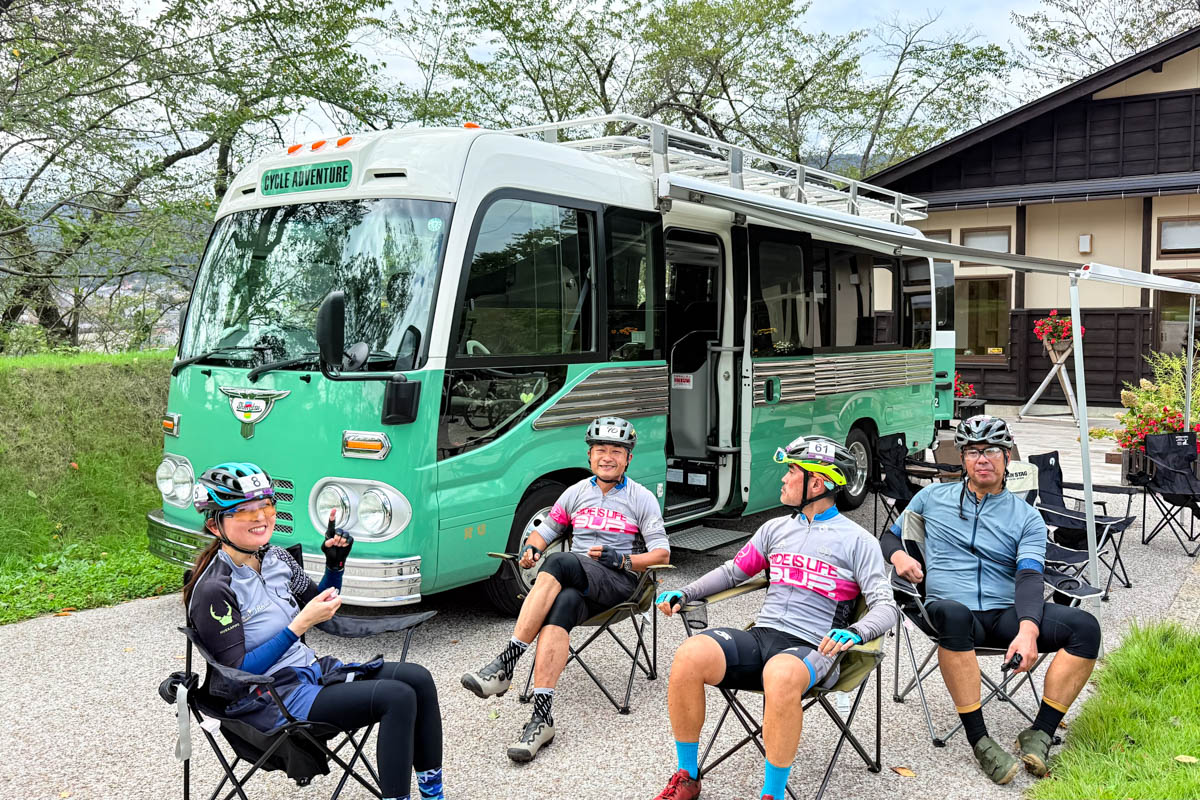 いいやま観光局自慢の信越自然郷サイクルツアーサポートバスで休憩 photo:Makoto AYANO