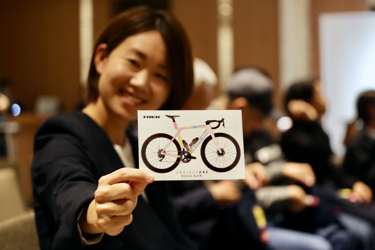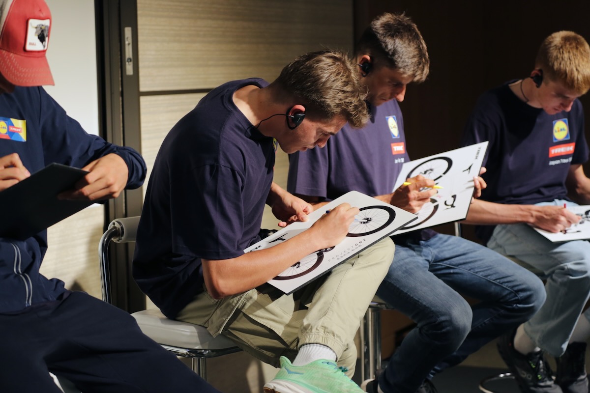 バイクとの対面を果たした選手たちはレセプション会場へと移動して、関係者向けのウェルカムパーティーへ。会場ではプロジェクトワンにちなんだ色塗りイベントも行われ、選手や来場者が色鉛筆(トレック特注のProject Oneクーピー!)で思い思いの一台を完成させたり、交流を楽しんだり。会場は和やかな雰囲気に包まれた。