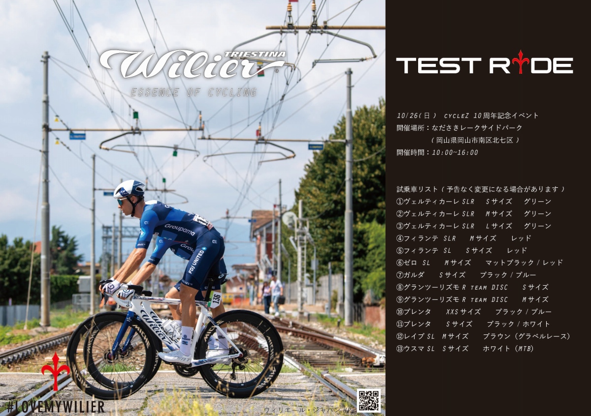 ウィリエールが10月26日(日)に岡山県のなださきレークサイドパークで開催される「cycleZ 10周年記念イベント」で試乗会を開催する。Verticale SLRやFILANTE SLRなどの最新ラインアップを試乗できる機会だ。以下、プレスリリースより紹介しよう。