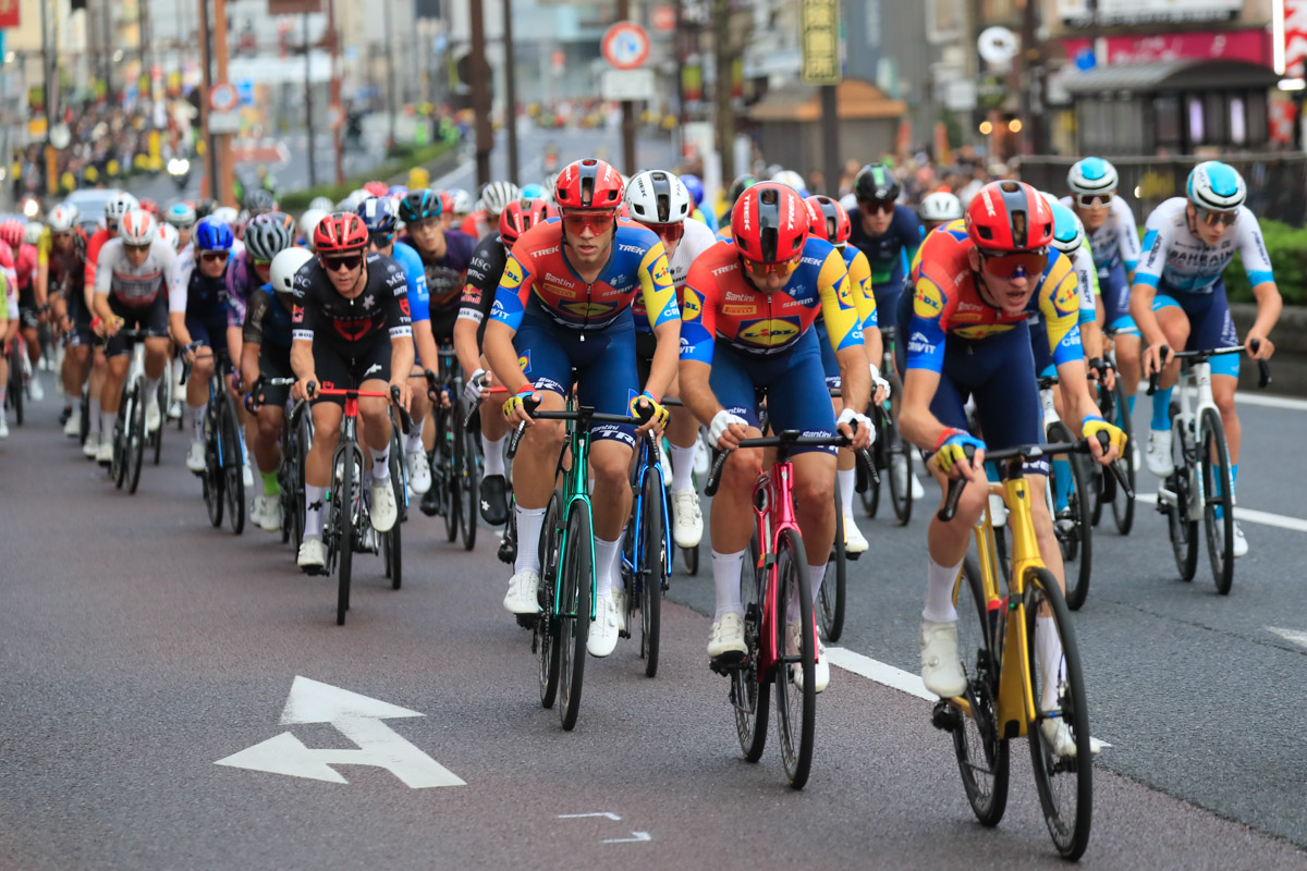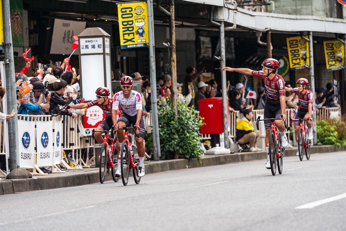 イスラエル・プレミアテックが積極的にアタックを仕掛けるものの、集団前方にメンバーを配置したリドル・トレックがその全てをチェックし、追いかけ、潰していく。メタリックカラーの特別バイクをあつらえたメンバーが、ツール・ド・フランスのマイヨヴェール(ポイント賞)をイメージしたグリーンバイクに乗るミランを勝たせるために、そしてジャパンカップクリテのチーム6連勝を達成するために、徹底的な集団コントロールを続けた。