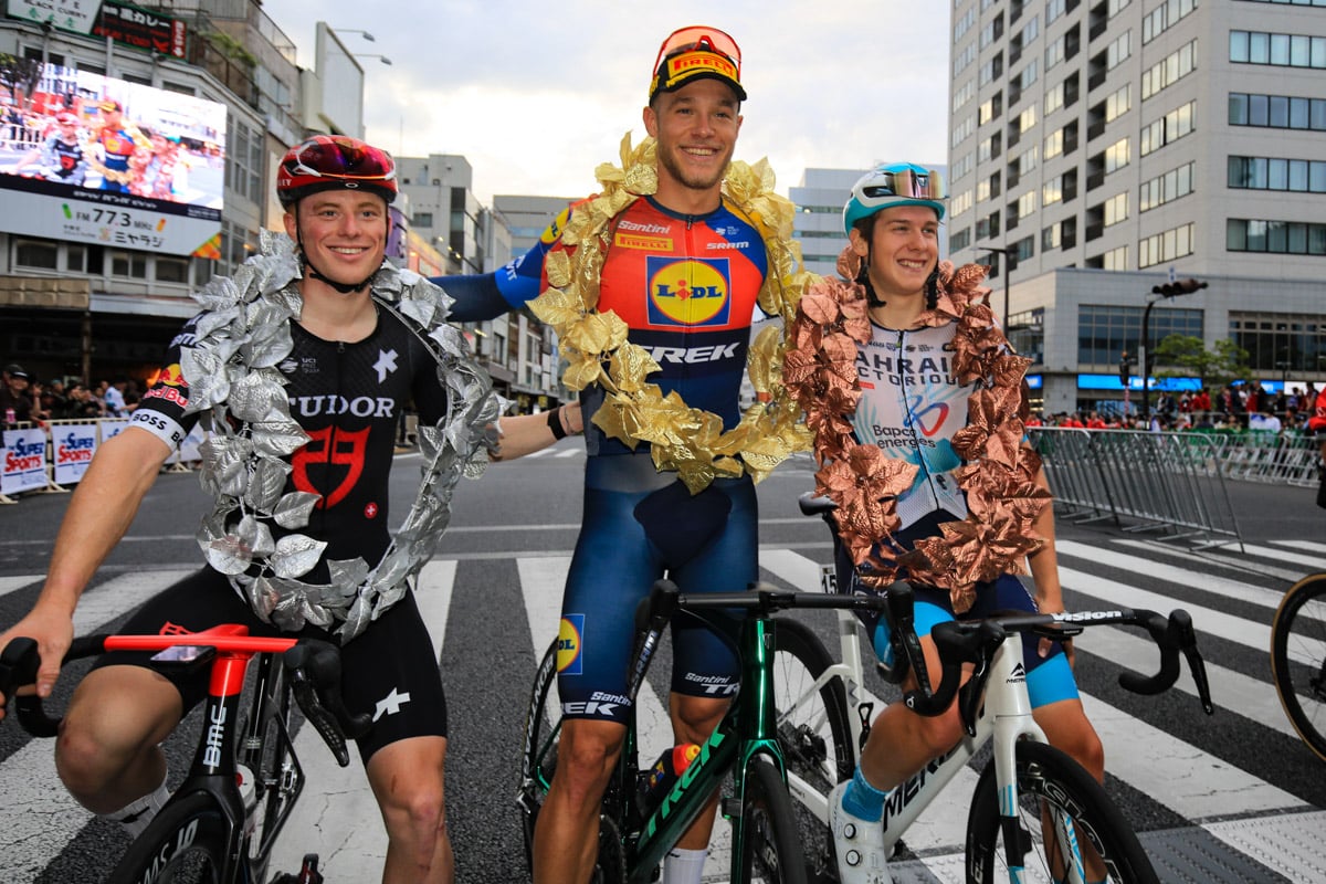 クリテリウム表彰式 優勝はジョナタン・ミラン(イタリア、リドル・トレック)、2位ミカ・ヘミング(ドイツ、チューダープロサイクリング)、3位フラット・ファンミヘレン(ベルギー、バーレーン・ヴィクトリアス) photo:Makoto AYANO
