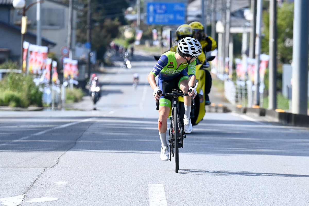 その後、下り切ったあとの県道で佐藤光(チームサイクラーズスネル)がアタック。数名が追従するも、「佐藤1人だけ脚が違った」とライバルが言うように、佐藤が単独先行で残り2周となる6周目に入っていく。後続集団との差は50秒まで開く一方、追走で飛び出す動きも見られたが、佐藤との差は縮まり切らないまま最終周回に入っていく。