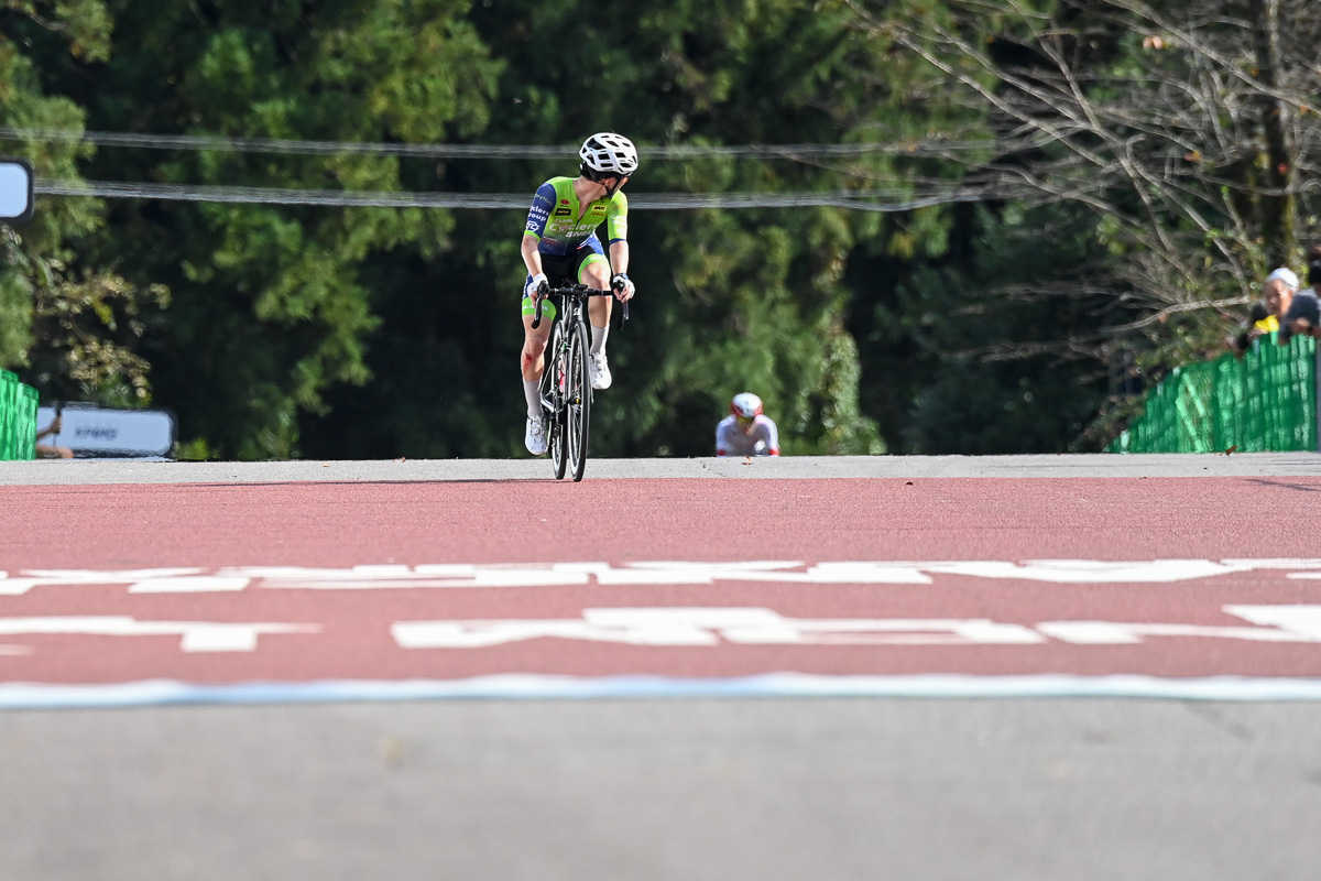 「阿見寺(俊哉)や高梨(万里王)さんら有力なメンバーが前にいなかったので、集団はチームメイトが抑えてくれると信じてアタックしたけれど、あんなに差が開くとは思ってなかった。平坦で捕まるかと思って内心ヒヤヒヤしながら逃げていた。2周目の下りで落車してしまい、その影響でフロントがアウター固定のまま残り5周を走っていたが、最後の登りは足がつるギリギリまでプッシュした。