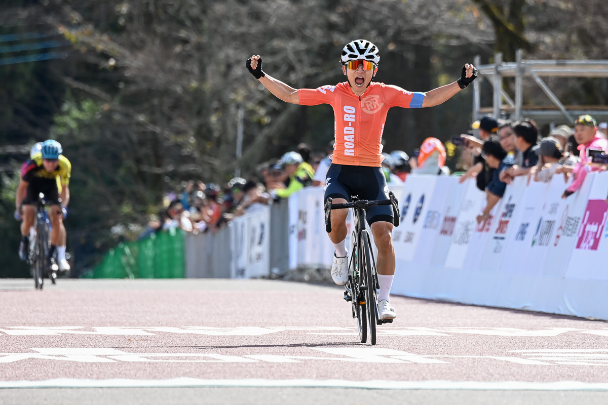 「序盤に落車した影響か、フロントギアがアウター固定になってしまっていた」と言う佐藤だが、大きく失速することなく最後の登りをクリア。それでもペースを上げた集団との差は30秒まで縮まり、単独追走する松村拓弥(日本ナショナルチーム)が見える距離に迫った。しかし佐藤は最後まで逃げ切り、残り100mで勝利を確信。ガッツポーズと雄叫びと共にフィニッシュラインを超えた。