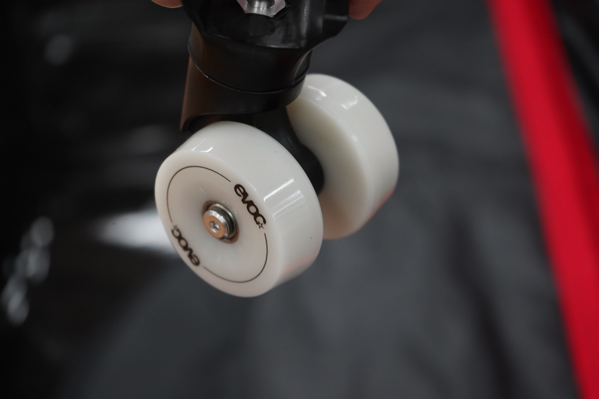 クリップオンホイール採用のBIKE TRAVEL BAGシリーズはホイールパーツの取り付け位置が改良された。また二輪になったことで安定性が増し、テーパー付きタイヤにより取り扱いが格段に軽くなった。