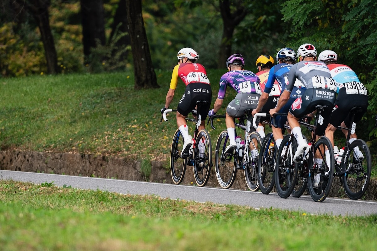 先日行われたUCIグラベル世界選手権で優勝したフロリアン・フェルミールス(ベルギー、UAEチームエミレーツXRG)らがスタートを切り、30km地点で19名による逃げ集団が形成された。ここにフェルミールスが入り、他には母国イタリア出身のディエゴ・ウリッシ(XDSアスタナ)やロレンツォ・ジェルマーニ(グルパマFDJ)など、豪華なメンバーが揃う。逃げは何度も丘を越えながらも、平均時速50km/hに迫るスピードで巡航し、メイン集団とのリードを1分半まで広げていった。