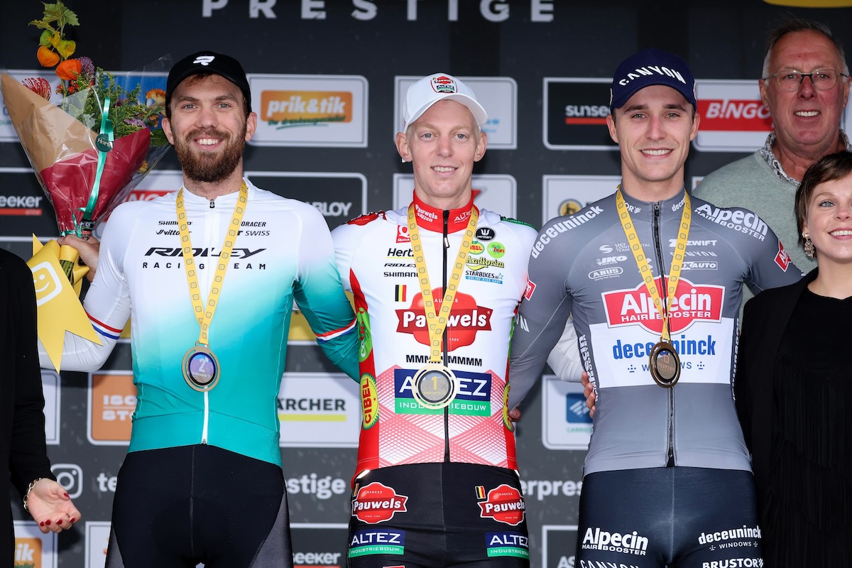 男子エリート表彰台:優勝ファントーレンハウト、2位ニューウェンハイス、3位ファンデプッテ photo:CorVos