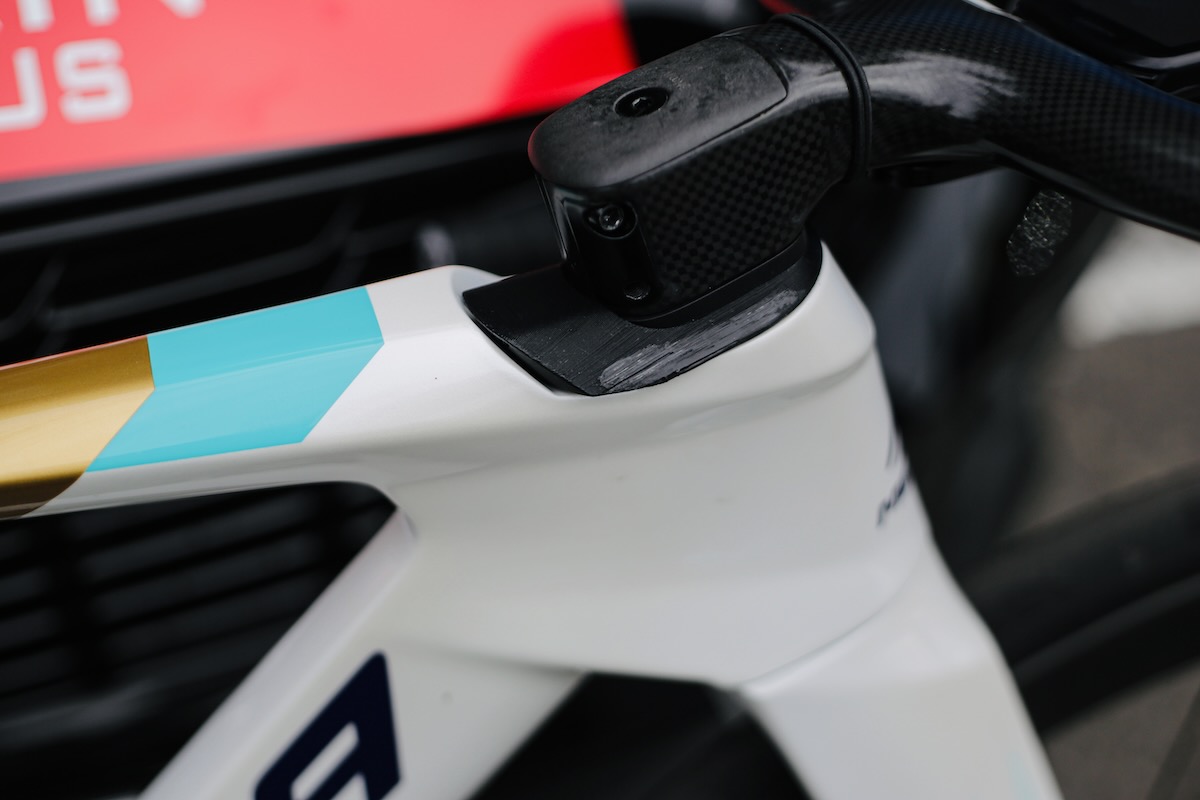 シートチューブ周辺の変化も顕著だ。現行モデルではリア三角内側のシートチューブ後端はリアタイヤに沿わせていたが、軽さを意識してか大幅にカット。さらにトップチューブとダウンチューブの接続部分も形状を変えるなど、アグレッシブなモデルチェンジが行われている。ヘッドのトップキャップはまだ製品版ができていないのか、3Dプリンターで出力されたプロトタイプと思われるものが取り付けられていた。
