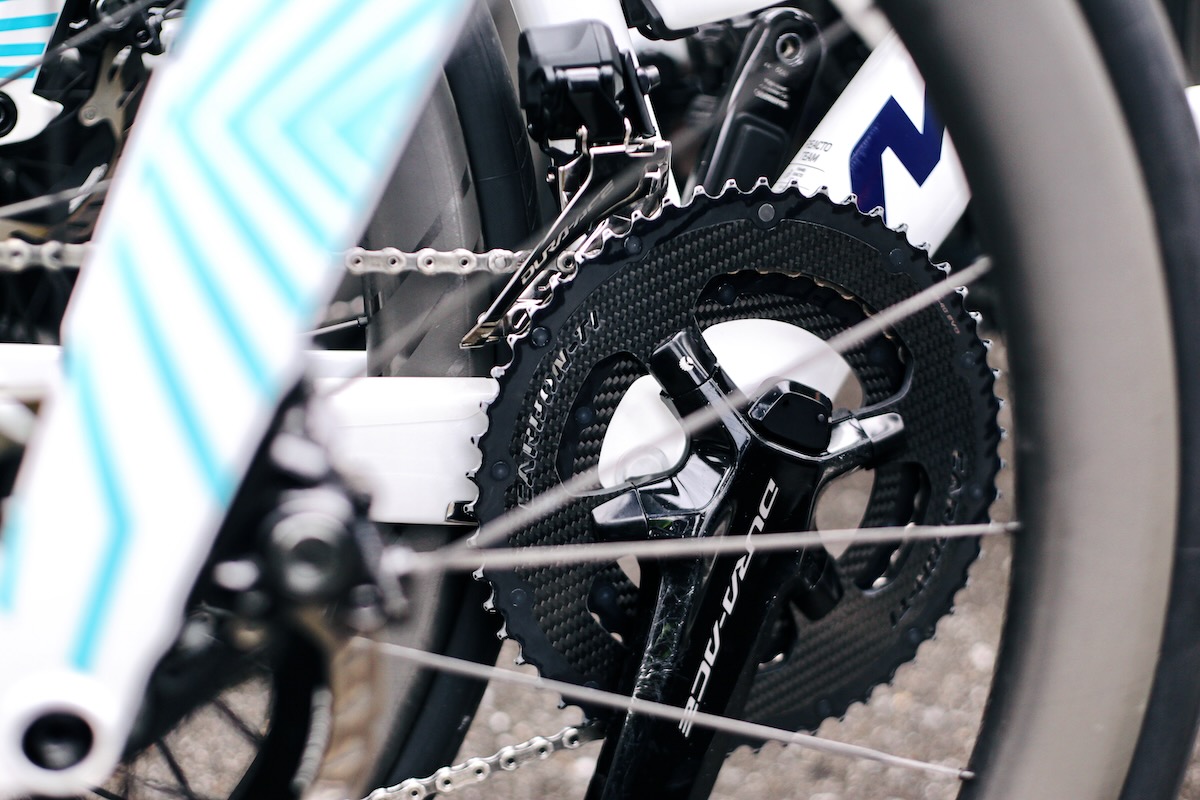 なお、ディレイラーハンガーはシンガポールの軽量パーツブランド、Tiparts.cc社の軽量チタンモデル(スペアバイクは純正品)。Carbon-Ti製のカーボンチェーンリングを使用するチームメイトもいたが、マルティネスのバイクには通常のDura-Aceリングが取り付けられていた。