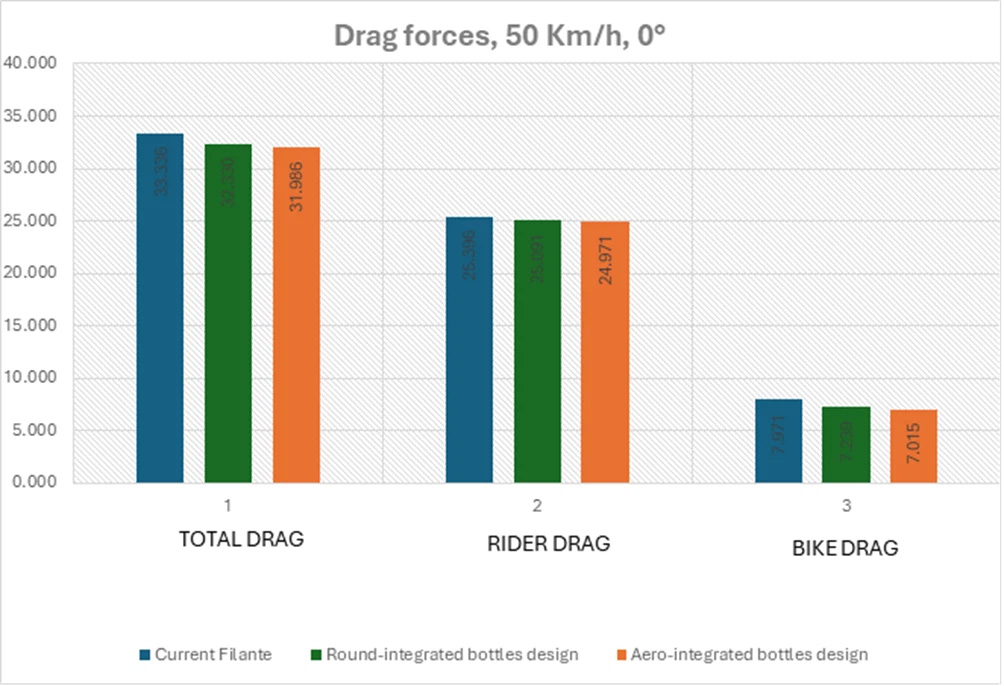 従来モデル(ブルー)と新型FILANTE+汎用ボトル(グリーン)、新型FILANTE+専用ボトル(オレンジ)の比較で、新型の抵抗が少なくなっている (c)Wilier