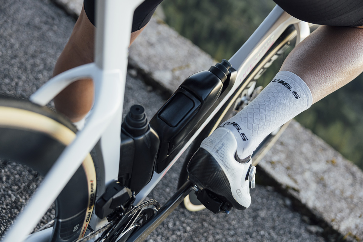 ウィリエールによると従来型FILANTE SLRと、新型FILANTE+専用ケージ+専用ボトルの比較では空気抵抗が4.5%低減されるという。さらに新型FILANTE+専用ケージ+汎用ボトルの組み合わせでも、従来型よりもエアロ効率が向上を確認したとウィリエールは説明する。シートチューブ側は最大750mlのボトルにも対応可能だ。