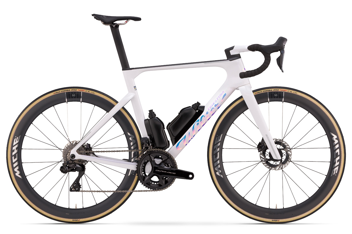 ラインアップはフレームセット(1,045,000円)、ULTEGRA DI2完成車(1,727,000円)、DURA-ACE DI2完成車(1,936,000円)、SUPERRECORD 13s(受注発注:2,640,000円、いずれも税込)が揃う。完成車のホイールはいずれもミケのKLEOS RD50だ。