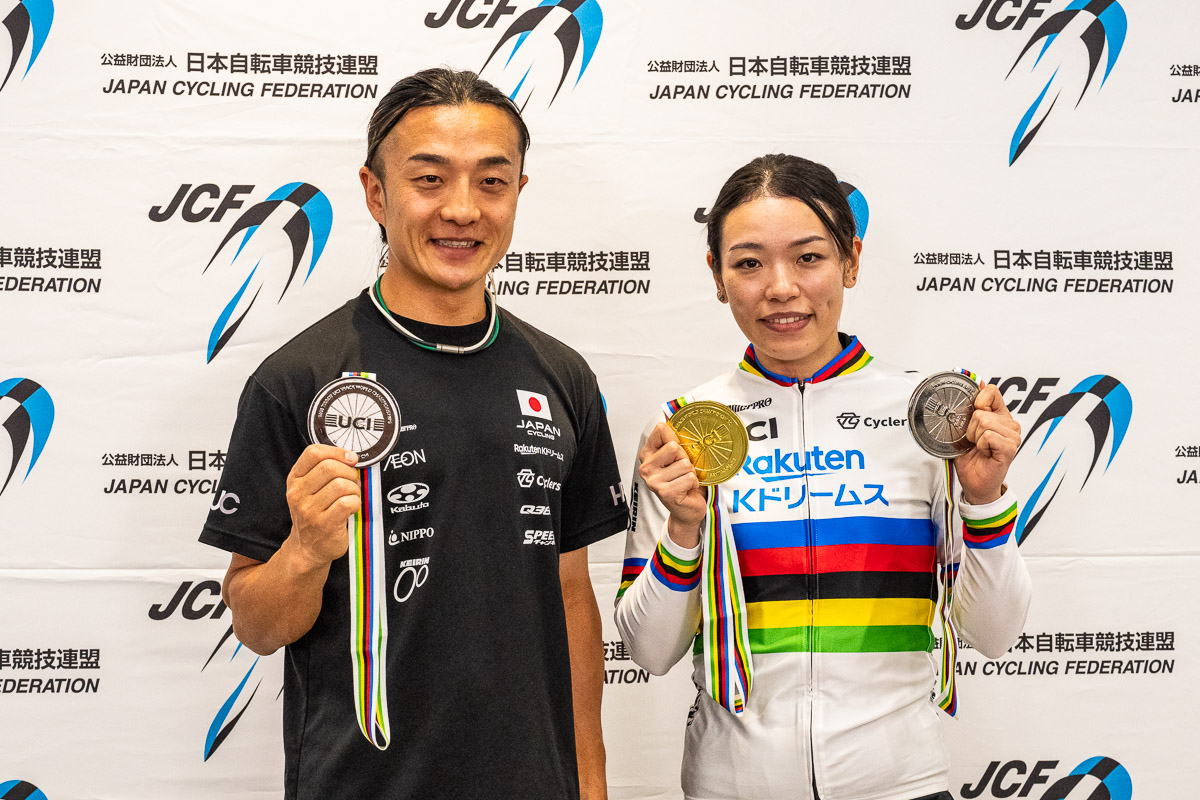 チリで開催されたトラック世界選手権に出場した日本ナショナルチームが10月30日に帰国。メダルを獲得した佐藤水菜と窪木一茂が記者会見に臨んだ。ケイリンで連覇を果たした佐藤は「嬉しさは昨年の方が上だが、今回は満足感が大きい」と語り、オムニアム銀メダルの窪木は「今回と同じ力を出せれば金メダルは近いと思う」と語った。