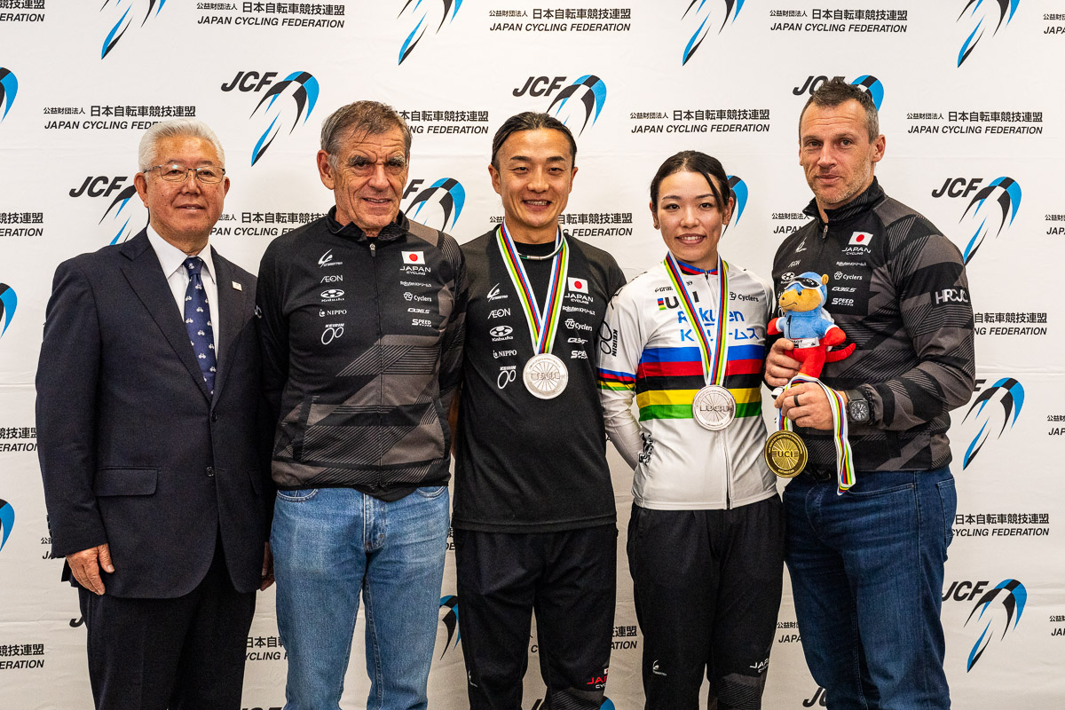 今大会では、佐藤水菜がケイリンで金メダル、スプリントで銀メダルを獲得。窪木一茂がオムニアムで銀メダルを獲得し、計3つのメダルがもたらされた。そのメダルを獲得した2人と日本ナショナルチームのコーチが、東京都内で記者会見に臨んだ。