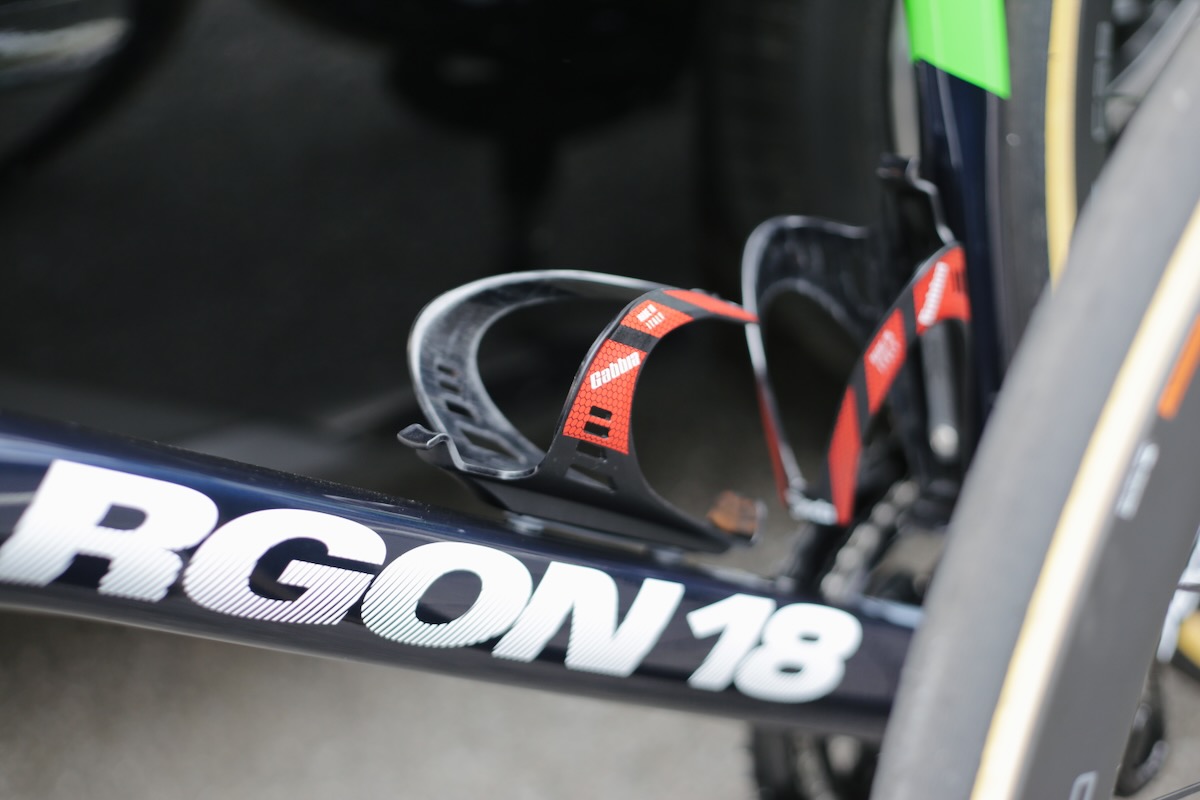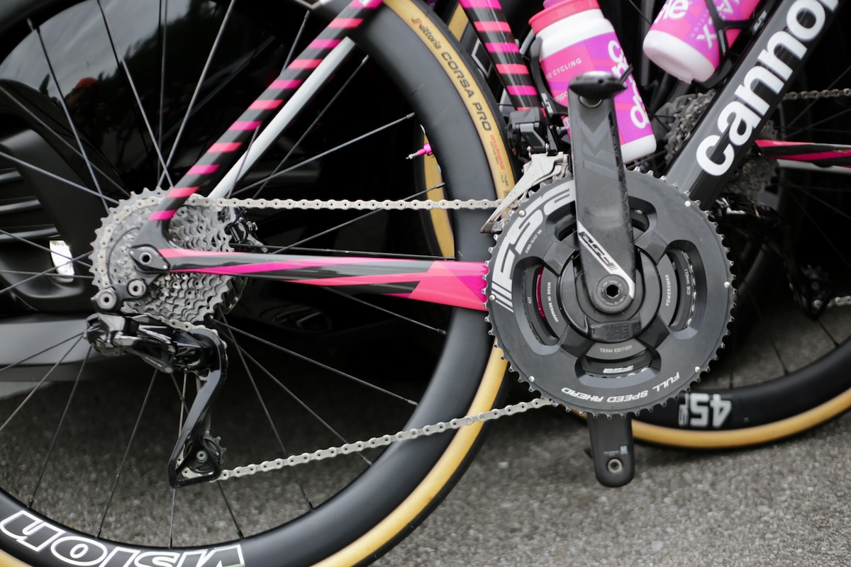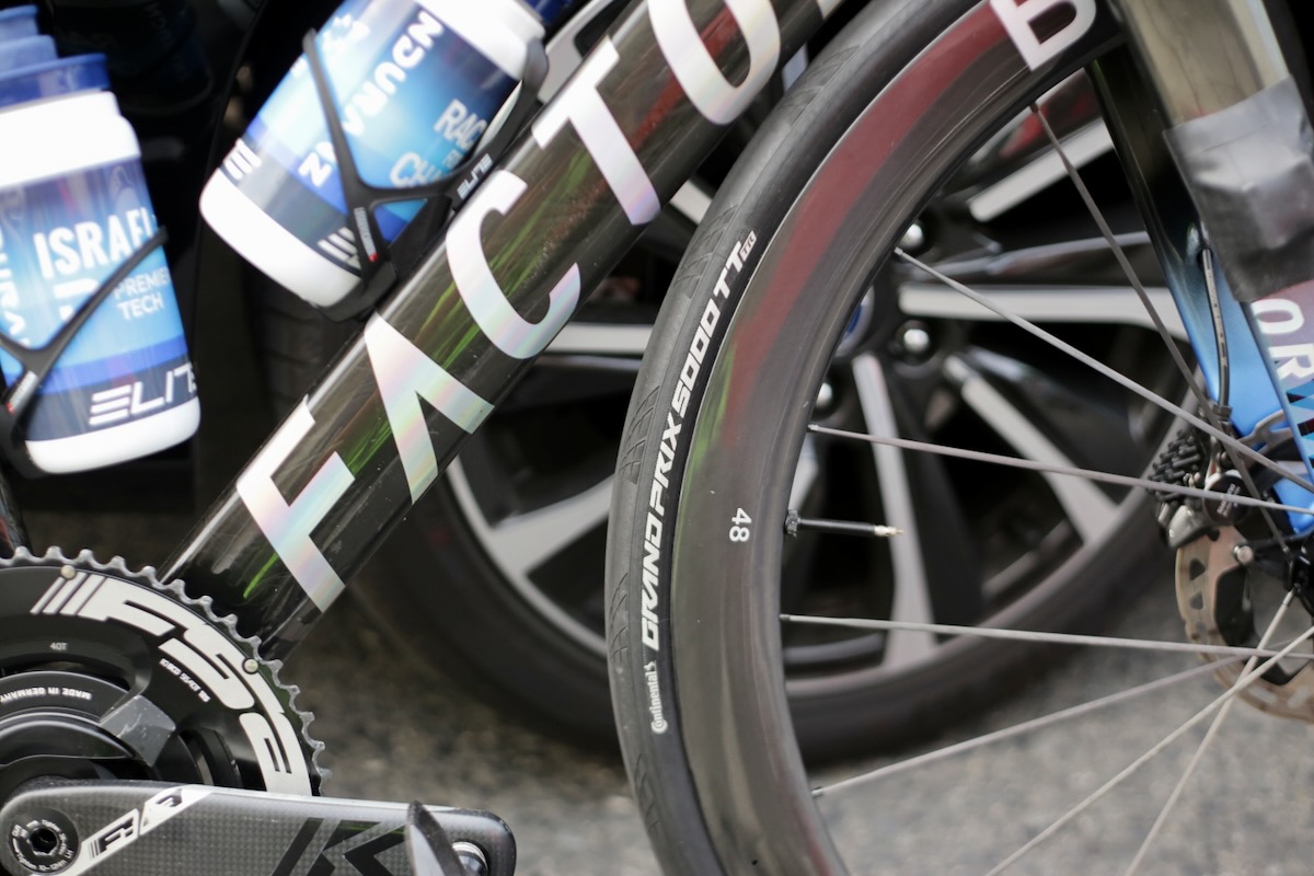 コンポーネントはシマノDURA-ACEを基本としつつ、サポートを受けるFSA/ヴィジョン製品を多用する。FSAのPOWERBOX K-FORCEクランクセットや、今年のストラーデビアンケから実戦投入されたヴィジョンのMetron RSホイールセットを使う。登坂対策でホイールはペア重量1,290gを誇る45 RSで揃えていた。組み合わせるタイヤは長らくパートナーシップを組むヴィットリアのCORSA PRO TLRで、幅は30c。同社のインサート「Air Liner」を投入していることも特徴で、チームカラーと揃いのマックオフのチューブレスバルブをセットする。