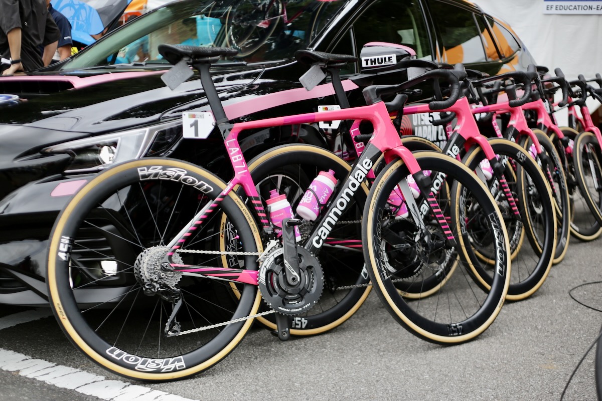 ジャパンカップ連覇を目指して来日したEFエデュケーション・イージーポストは、今年もキャノンデールのハイエンドモデルであるSuperSix EVOを駆る。色合いの異なるピンクを組み合わせたバイクとチームキットはプロトンの内の注目の的。フレームにはLAB71のネームが記されているが、実際はHi-MODグレードだ。