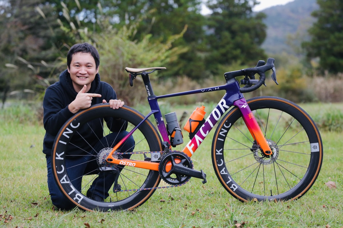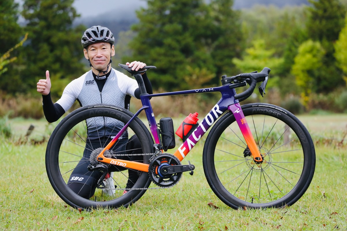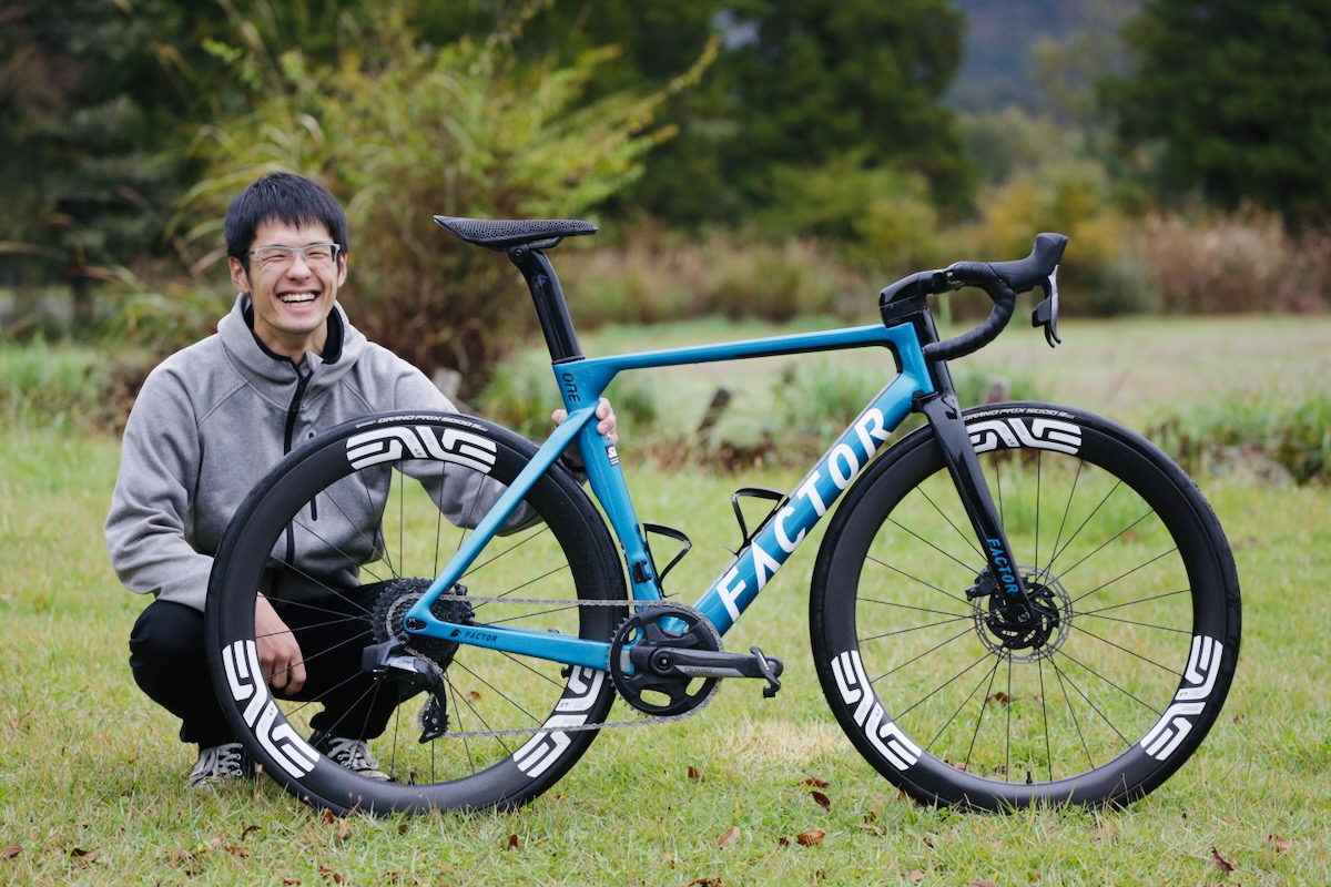 「まさかONE仲間(筆者のことです)に会えるとは思ってなかったです」と笑うのは一杉研斗さん。TTバイクのようなヒンジ式フォークや双胴ダウンチューブを装備し、ファクターの中でもひときわ存在感を放つエアロロード、ONEが愛車だ。
