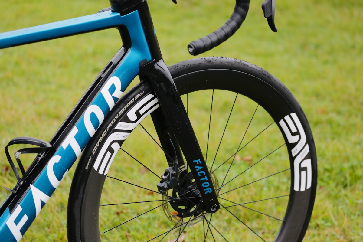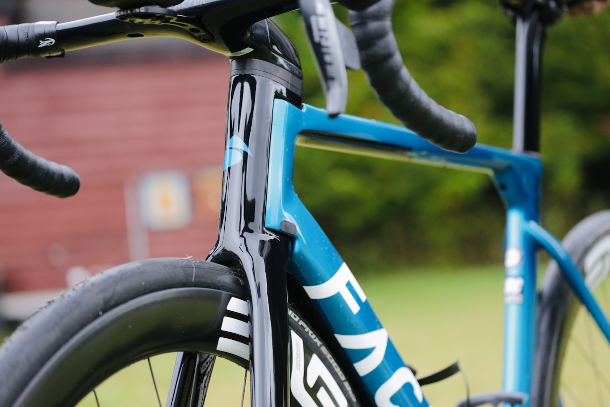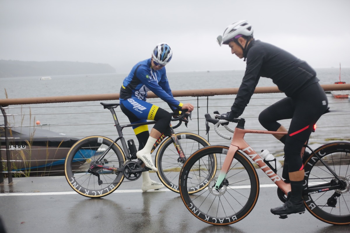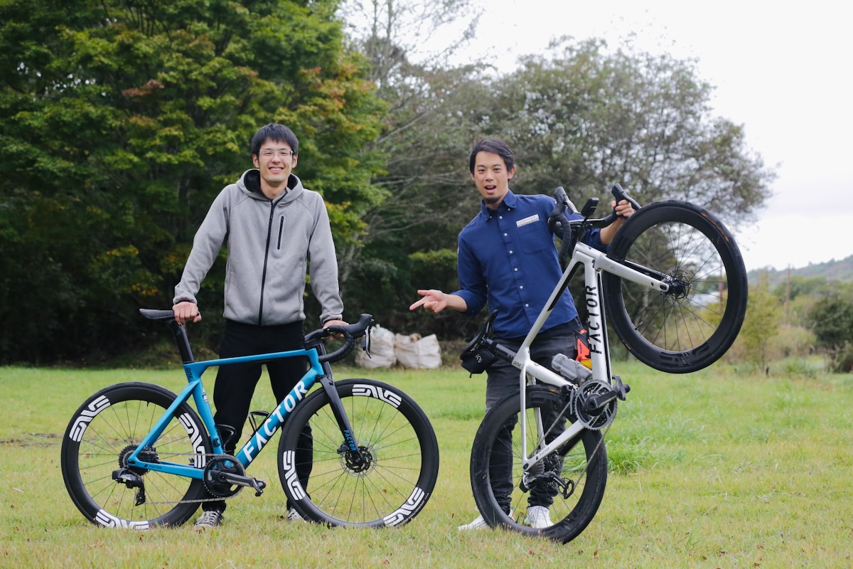 「まさかONE仲間(筆者のことです)に会えるとは思ってなかったです」と笑うのは一杉研斗さん。TTバイクのようなヒンジ式フォークや双胴ダウンチューブを装備し、ファクターの中でもひときわ存在感を放つエアロロード、ONEが愛車だ。
