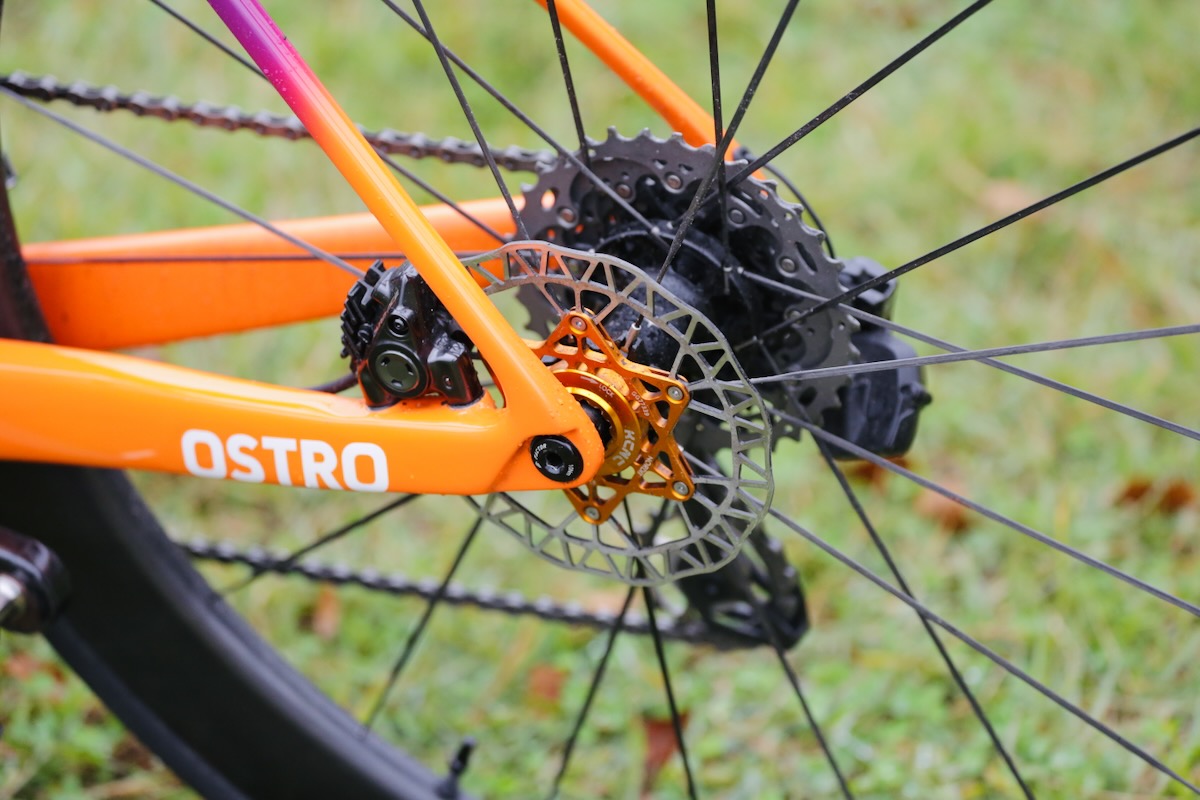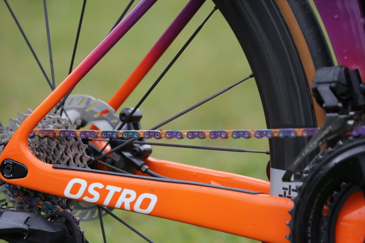 「ヒルクライムを頑張っているので、本当は(軽量モデルの)O2が良いなって思っていたんです。でも試乗したらOSTROの方が走りが好みだった」と言うのは大家博史さん。実は初代OSTROからの乗り換えで「初代は整備性がちょっと微妙なところもありましたが、その辺はしっかり改善されてます。乗り心地も良くなったし、より走りやすくなった印象ですね」と太鼓判を押す。カラーはオレンジとパープルのグラデーションが目立つヒューマンパワードヘルスカラーで、各パーツもフレームに合わせてカラーコーディネイトしている。