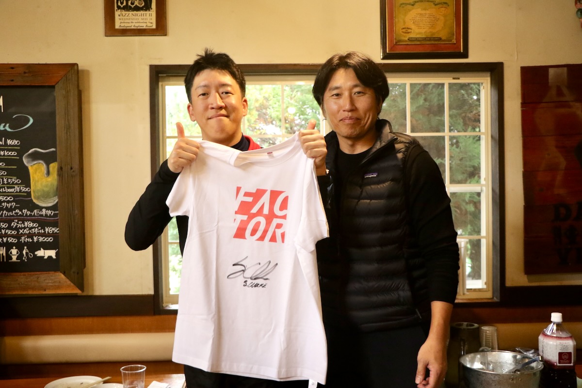 じゃんけん大会の優勝賞品は、プロ選手のサイン入りTシャツ。トライスポーツ社長の霊山高志さんよりプレゼント photo:So Isobe