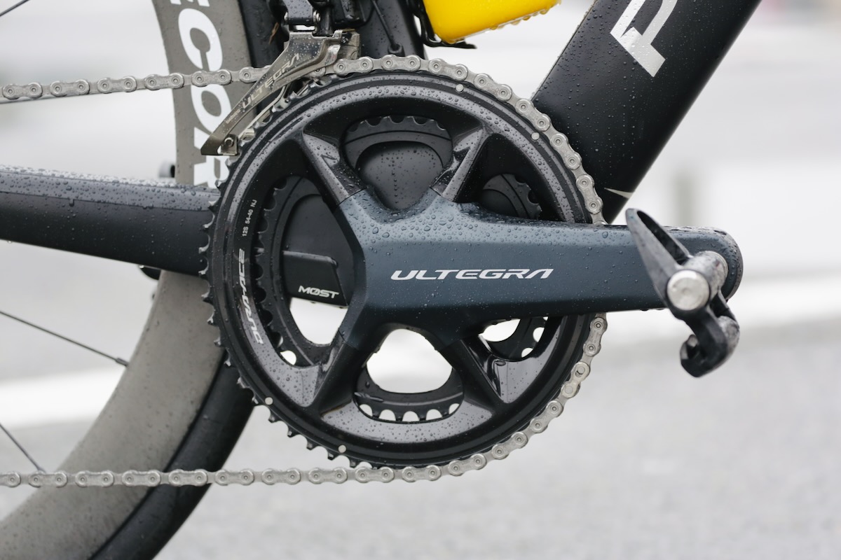 コンポーネントはアルテグラをベースに、チェーンリングのみデュラエース(54-40T)。「アルテだと大きいチェーンリングが無いんですよ(最大は52-36T)。やっぱり掛かりがいいですね。トラックをやっていると、どうしても大きいギアを選びたくなります」。