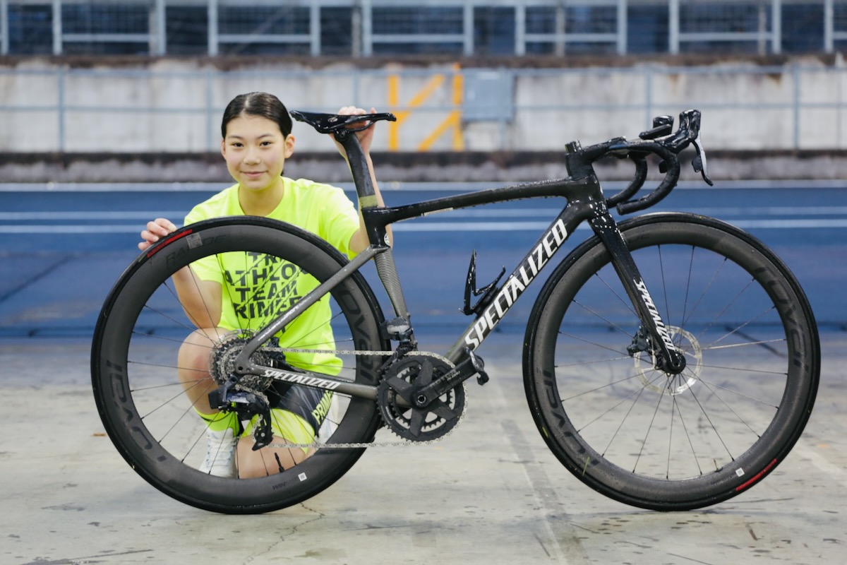 愛車はスペシャライズドのTarmac。「トライアスロンのショップの方がコーチの知り合いで、いいのがあるよって紹介してくれたんです。特にこだわりはなかったけど、乗ってみたらすごく良くて」と、素直な笑顔。「夏休みにはカナダでトライアスロンの合宿にも行きました。サマーキャンプみたいな感じで、練習ばかりだったけど楽しかったです」。