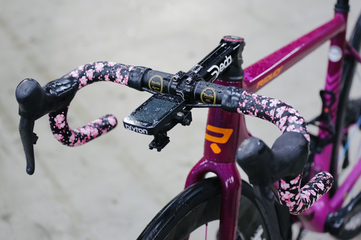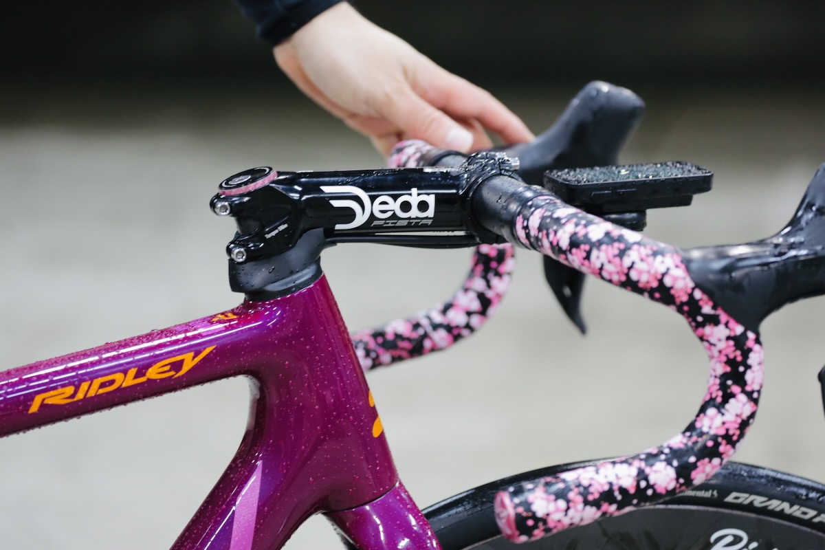 愛車はリドレーの軽量モデルであるHelium SLX。平坦が得意なのにHeliumを選んだ理由は振りの軽さ。「このバイクは踏み出しの軽さと反応の速さが絶妙なんですよね」と走りを語る。鮮やかなパープルとピンクの差し色が目を引くフレームは、まさに半田さんのアイデンティティ。「ピンクが好きなんです。お店のテーマカラーもピンクなので、統一感があるでしょ(笑)」。