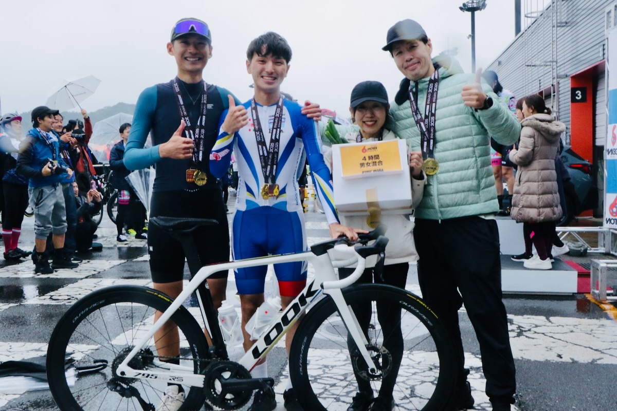 「いやぁ、最後はちょっとラッキーでした(笑)」と笑うのは、4時間エンデューロ・ロードソロ総合優勝の工藤政幸さん。レースでは最終周回で一時遅れながらも、先頭復帰してゴール勝負を制するという粘り勝ち。「登りで千切れちゃったんですけど、みんな疲れてるし、最後だからもう一度追いつけるかもって。スプリントは得意じゃないので勝負に加われれば良かったんですが、(2位に入った)坂大恵太さんの後ろに入れて、ラインが分かれたタイミングで思い切って踏みました」と振り返る。そしてフィニッシュライン上で差し切って優勝。最後は運良く差せちゃった、と言うものの、それは「差せちゃった」じゃなくて「差した」んですよ(取材班はバッチリ見てました)!