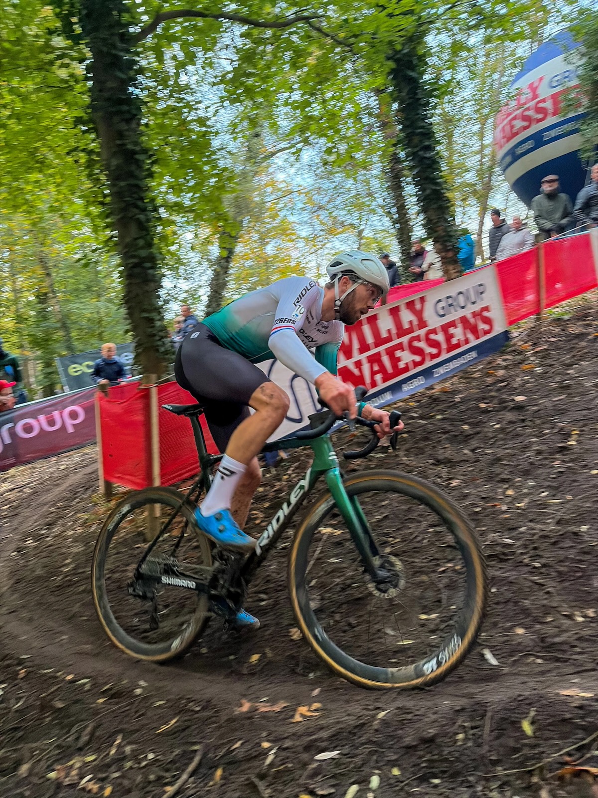 溝を越える際の衝撃でレバーが緩み、交換したバイクもサドルが下を向くトラブル。砂区間での前転、さらにスリップダウン。翌週末に迫った欧州選手権に弾みを付けたかった2世選手が15位まで沈む一方、先頭ではヨリス・ニューウェンハイス(オランダ、リドレーレーシングチーム)が独走体制に持ち込んだ。