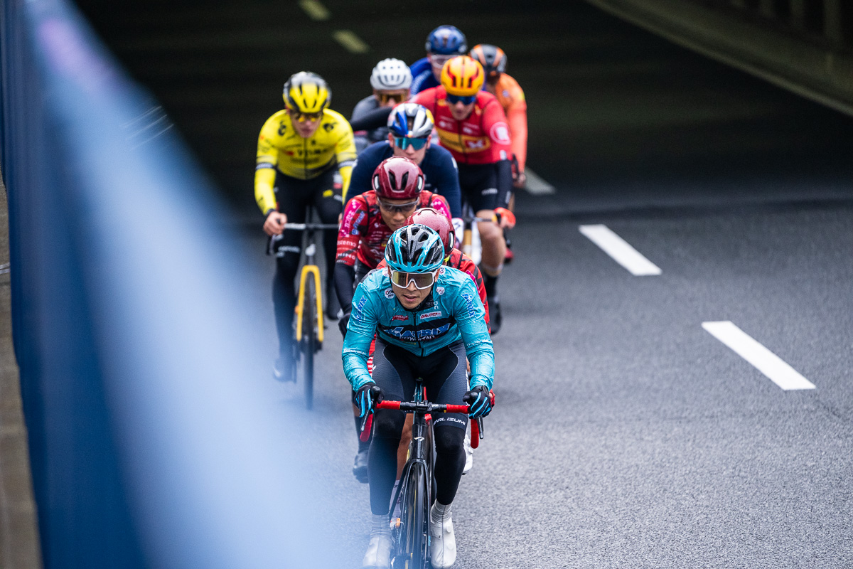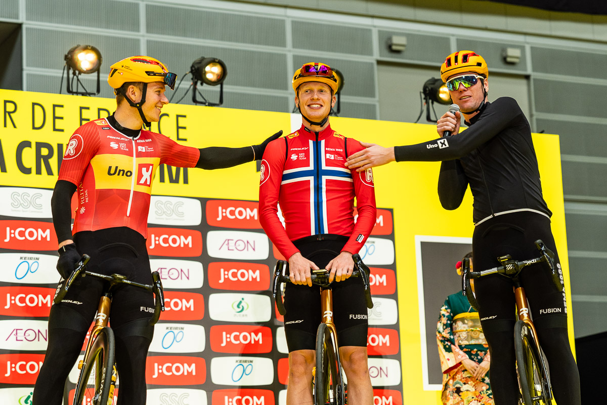 昨年のメインアリーナから例年通りのコミュニティアリーナに戻ったレースは、3.5kmを合計17周する総距離59.5km。フィニッシュラインに引かれたアクチュアルスタートを切ると、ヨナス・アブラハムセン(ノルウェー、ウノエックス・モビリティ)が飛び出し、これが引退レースとなるAstemo宇都宮ブリッツェンの小野寺玲と花田聖誠の2名が追従した。