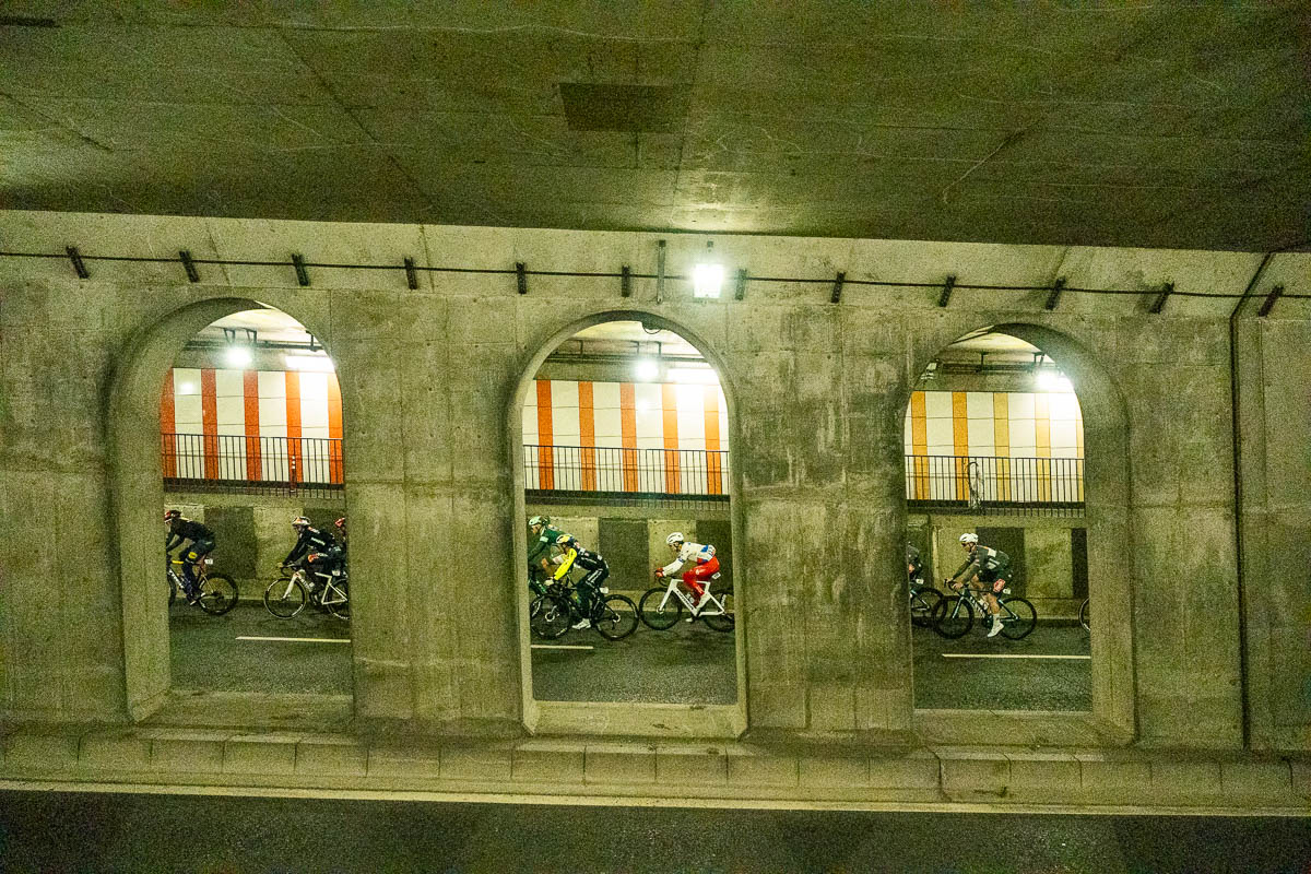 外国チームの選手22名、国内チームの23名、合わせて45名の選手たちによる集団の先頭には、ツールで過去2度(2023、24年)の総合優勝を果たし、今年総合2位だったヨナス・ヴィンゲゴー(デンマーク、ヴィスマ・リースアバイク)やプリモシュ・ログリッチ(スロベニア、レッドブル・ボーラ・ハンスグローエ)が並ぶ。さらに、今年ツール初出場ながら区間2勝とマイヨヴェール(ポイント賞)を獲得したジョナタン・ミラン(イタリア、リドル・トレック)など、紛うことなき世界トップ選手たちが集結。そしてスタートが告げられると、アリーナ内の出発地点をゆっくりと発進した。