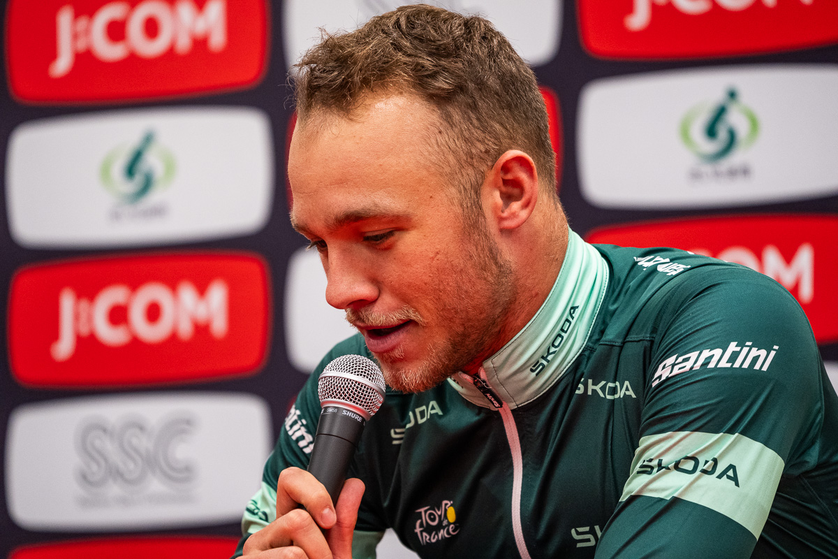 記者の質問に答えるヨナス・ヴィンゲゴー(デンマーク、ヴィスマ・リースアバイク) photo: Yuichiro Hosoda